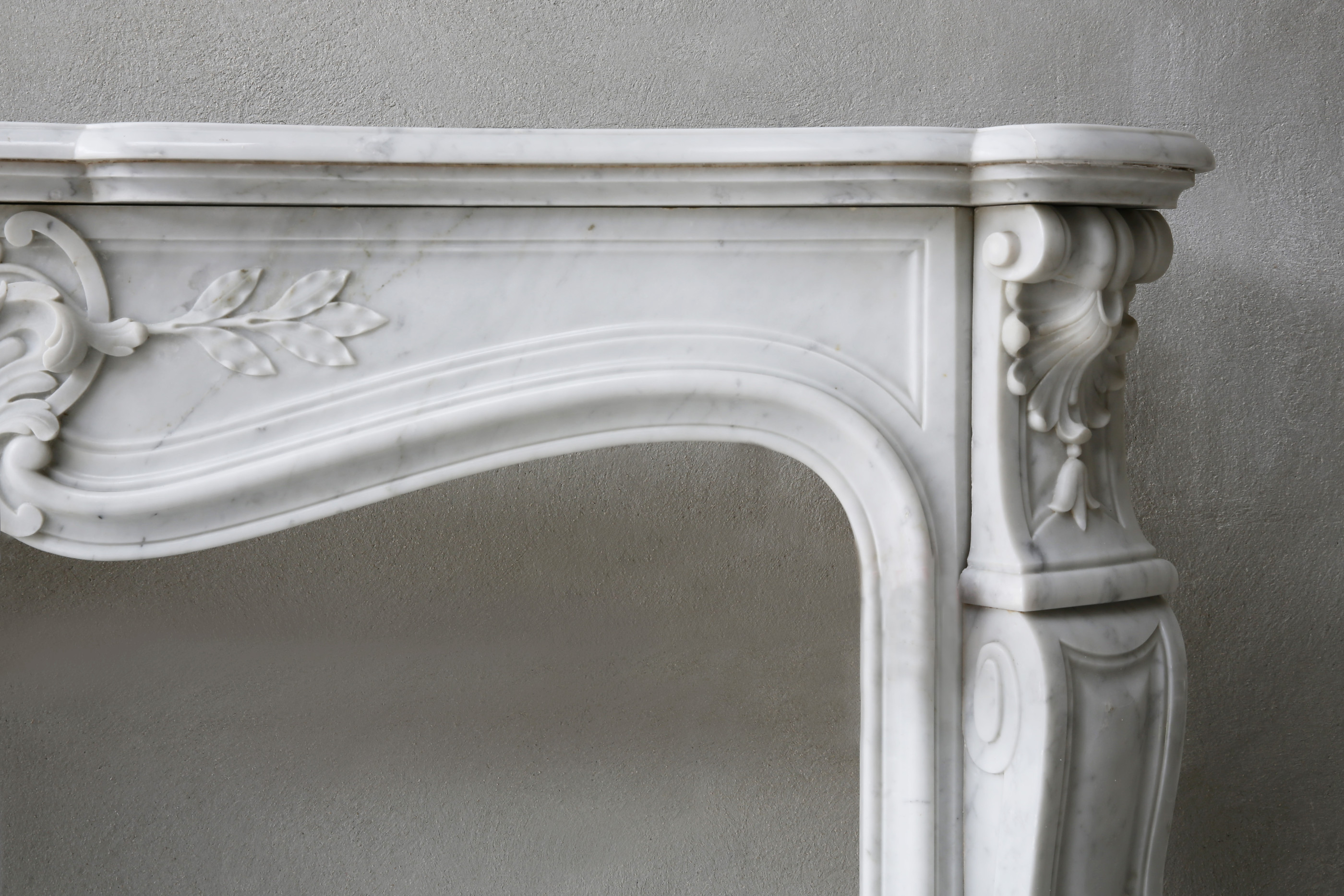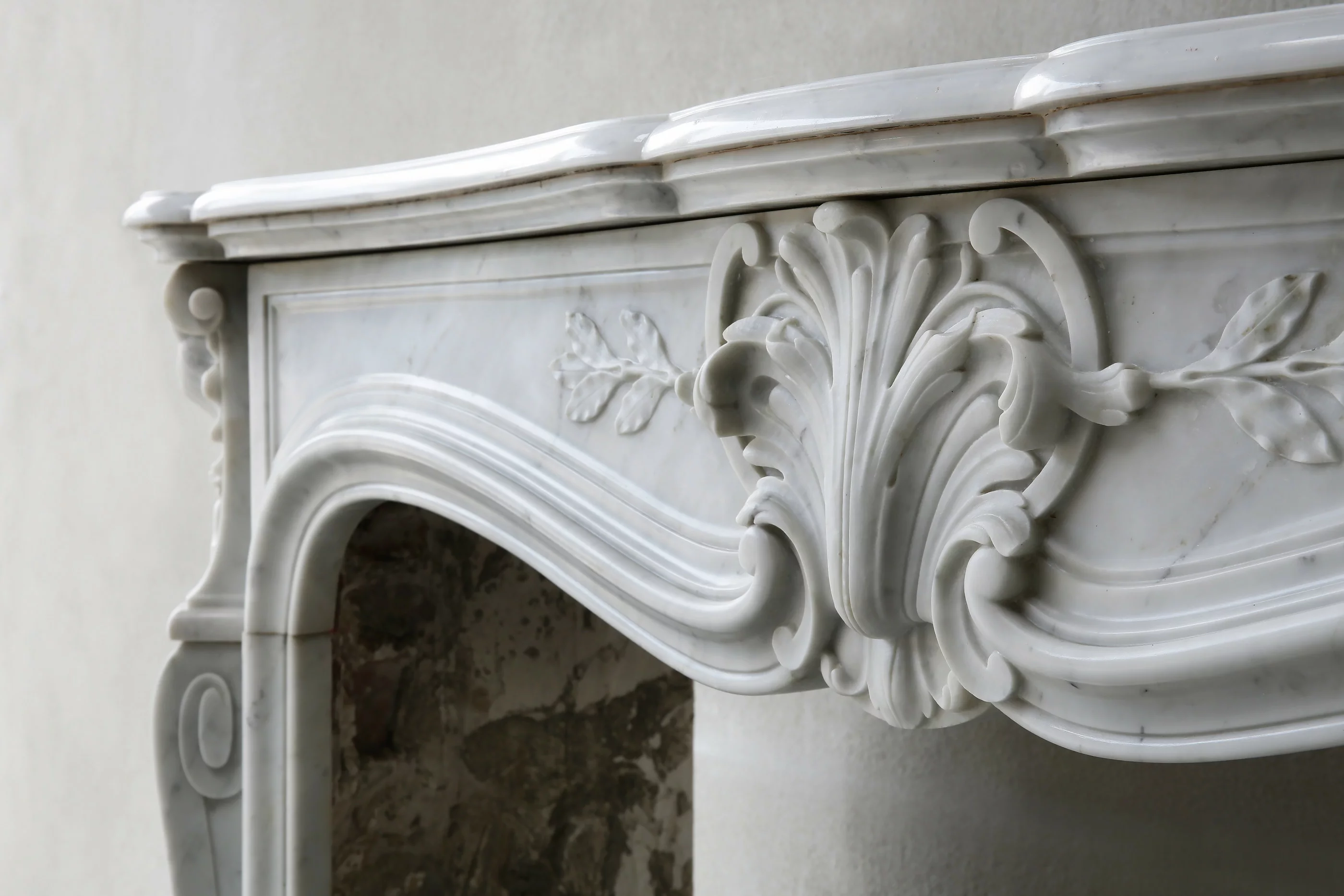 This elegant antique marble fireplace mantel is a fine 19th-century example of Louis XV design, crafted from soft-veined Carrara marble. Its graceful, curved silhouette and the intricately carved shell and foliage motif lend it a poetic softness—perfect for classic interiors, light-filled spaces or curated restoration projects.