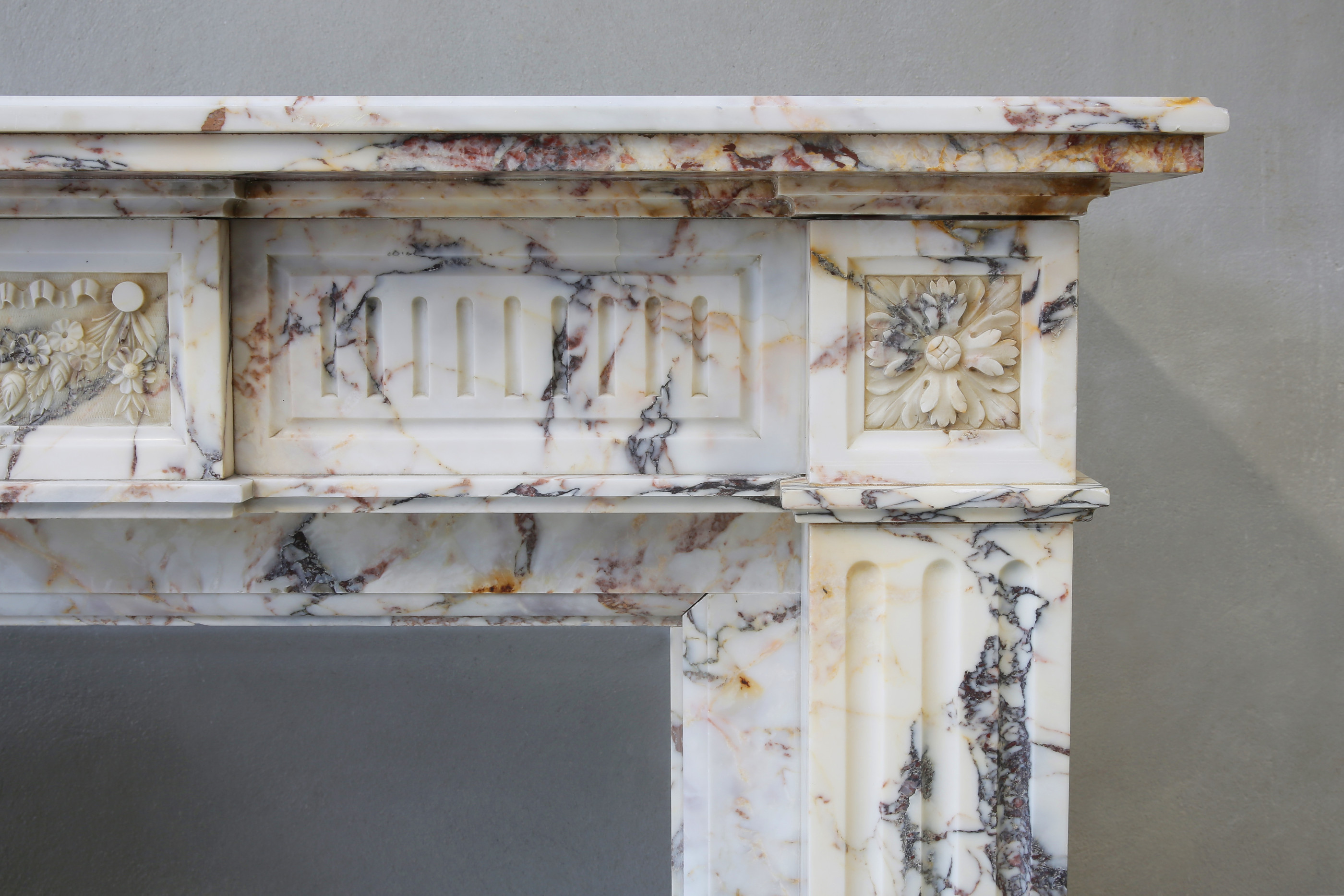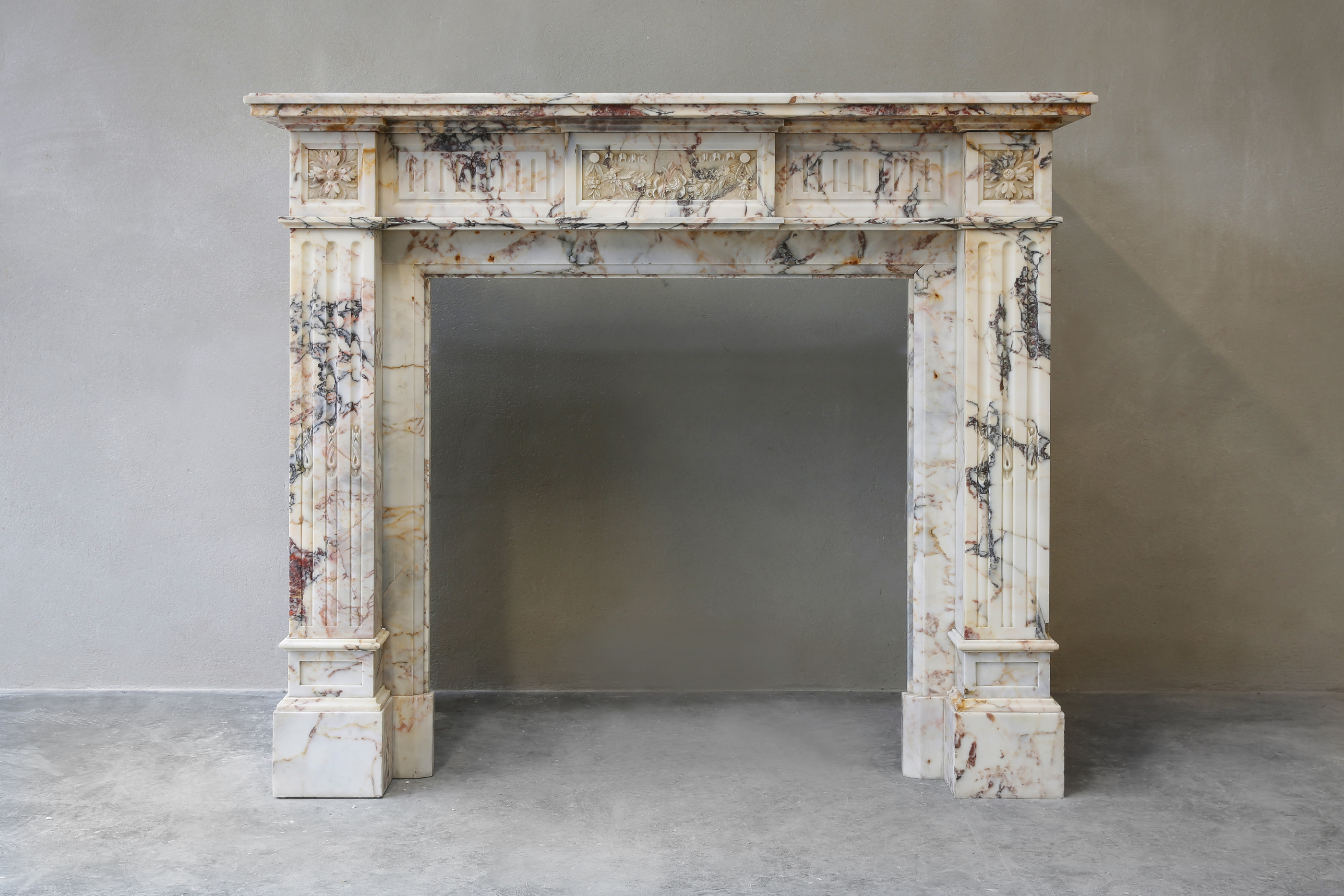 Beautiful elegant antique fireplace made of Breche marble. This fireplace dates from the 19th century and is in the style of Louis XVI. The warm color scheme in combination with the sleek shapes make this fireplace a valuable mantle within our collection!