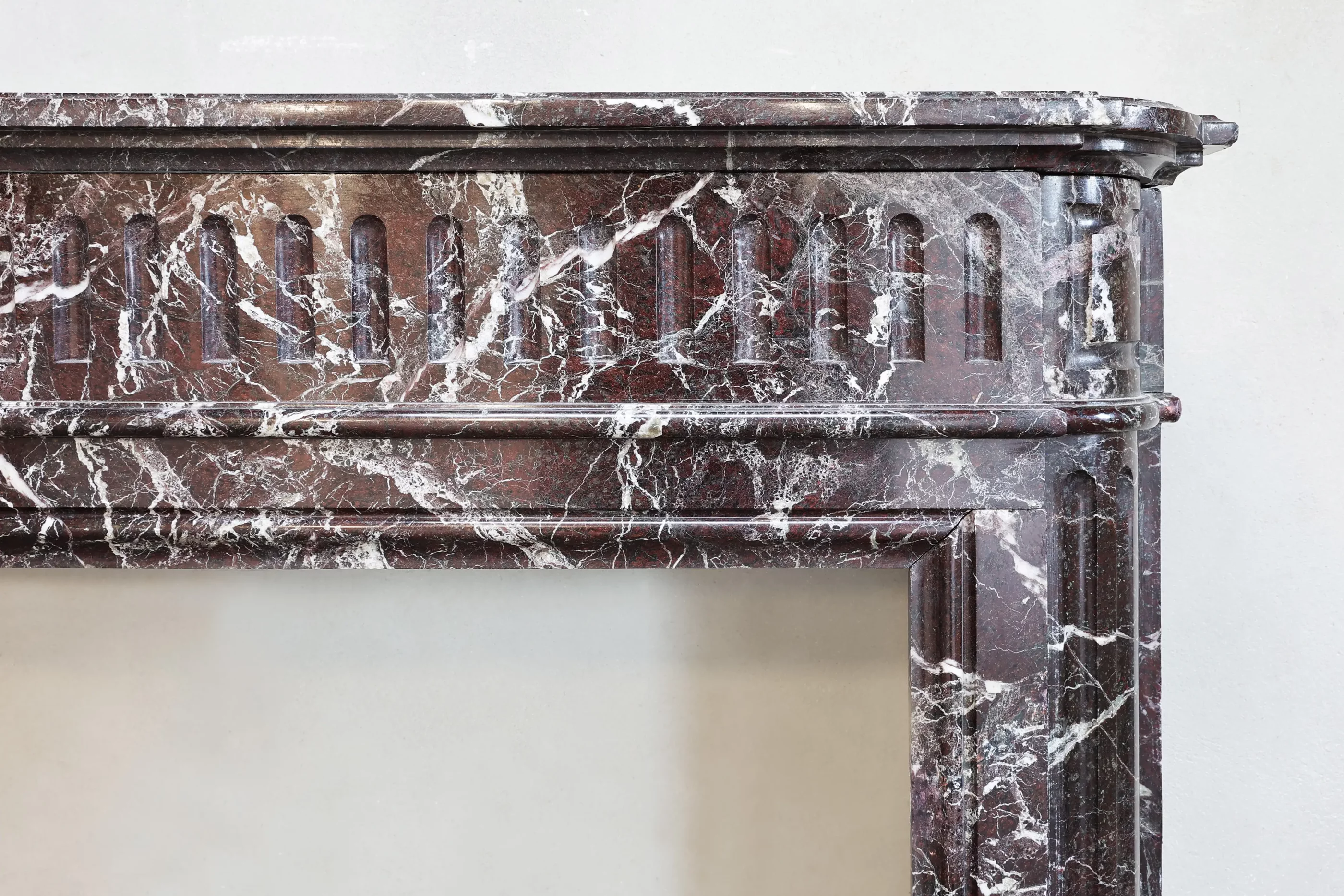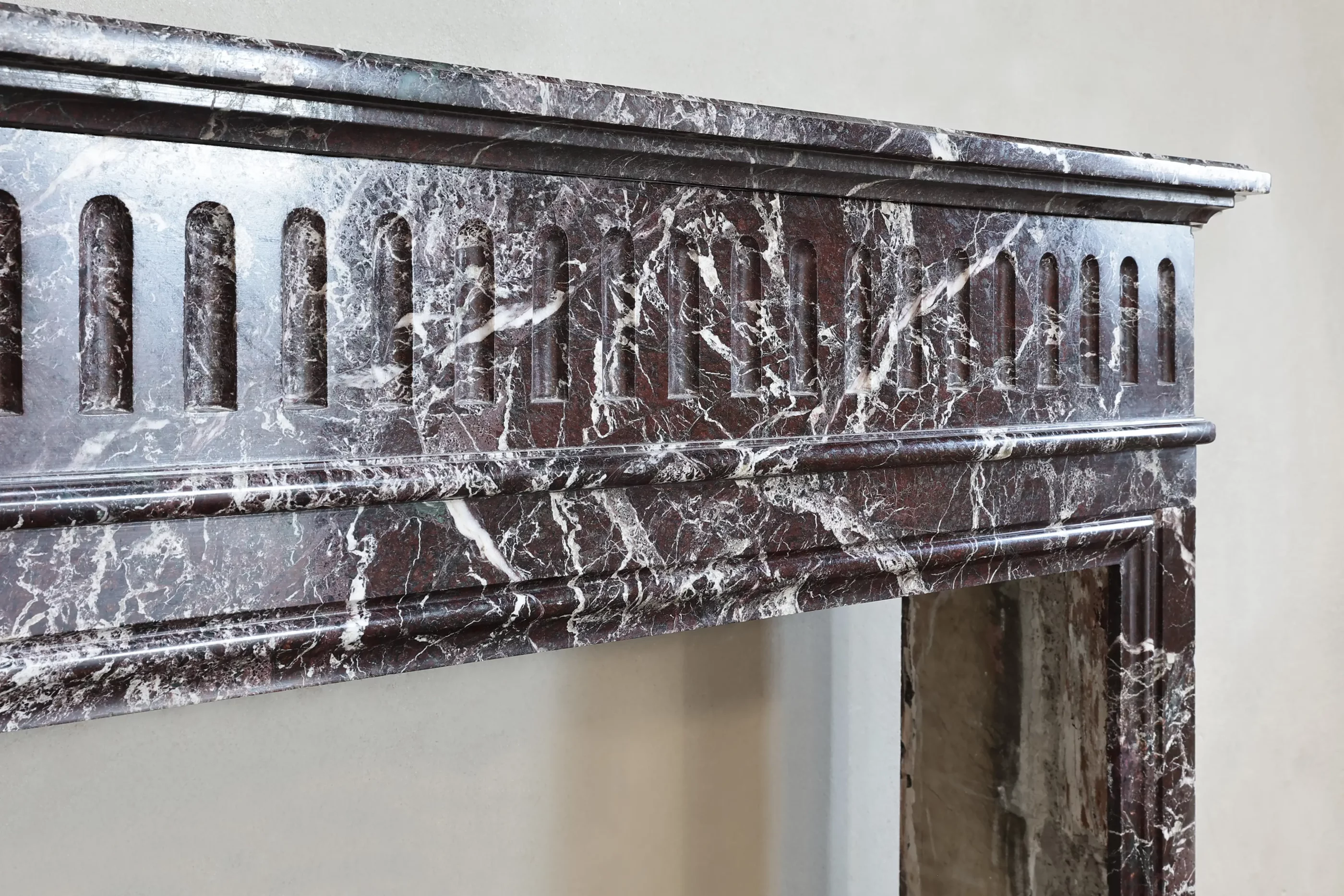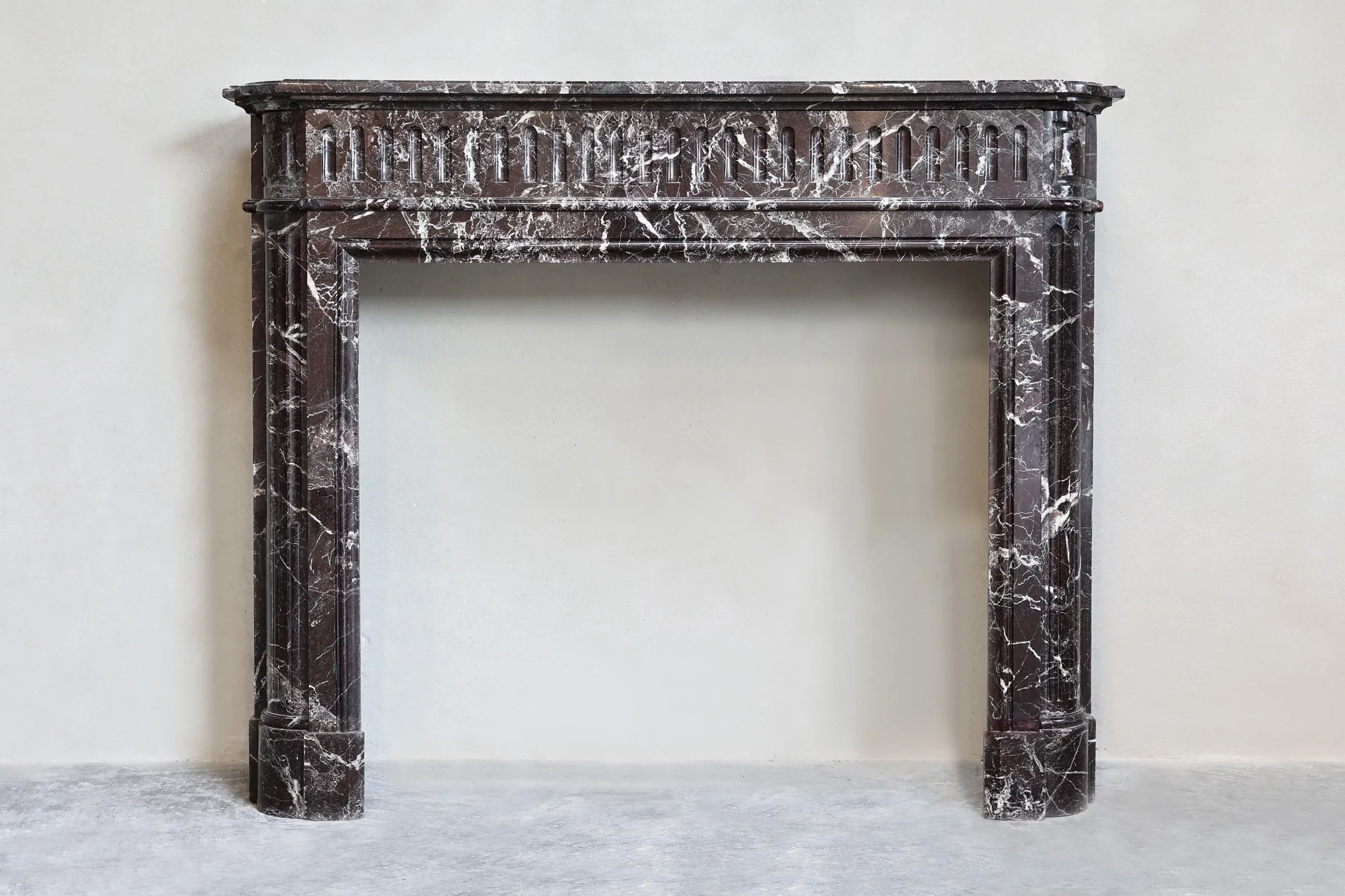This Antique Marble Mantel is a restrained Louis XVI composition: straight, balanced legs, a broad frieze, and a demi-lune (half-moon) plan that softens the façade without becoming ornate. The Levanto Rouge marble reads as a deep red field with natural movement in the stone.