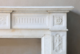 Very beautiful antique fireplace that is richly decorated with decorative elements and therefore has an elegant appearance. This Carrara marble mantel dates from the 19th century and is in the style of Louis XVI. A straight fireplace with various ornaments in the front part and on the legs.