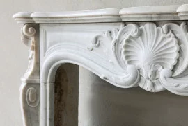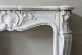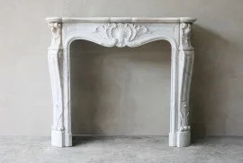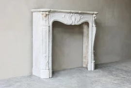 Beautiful compact and antique fireplace of Carrara marble from Italy! This fireplace is in the style of Louis XV and has 'trois coquilles', a large shell in the middle of the front part and two shells on the legs. The fireplace dates from the 19th century and has an elegant and graceful appearance.