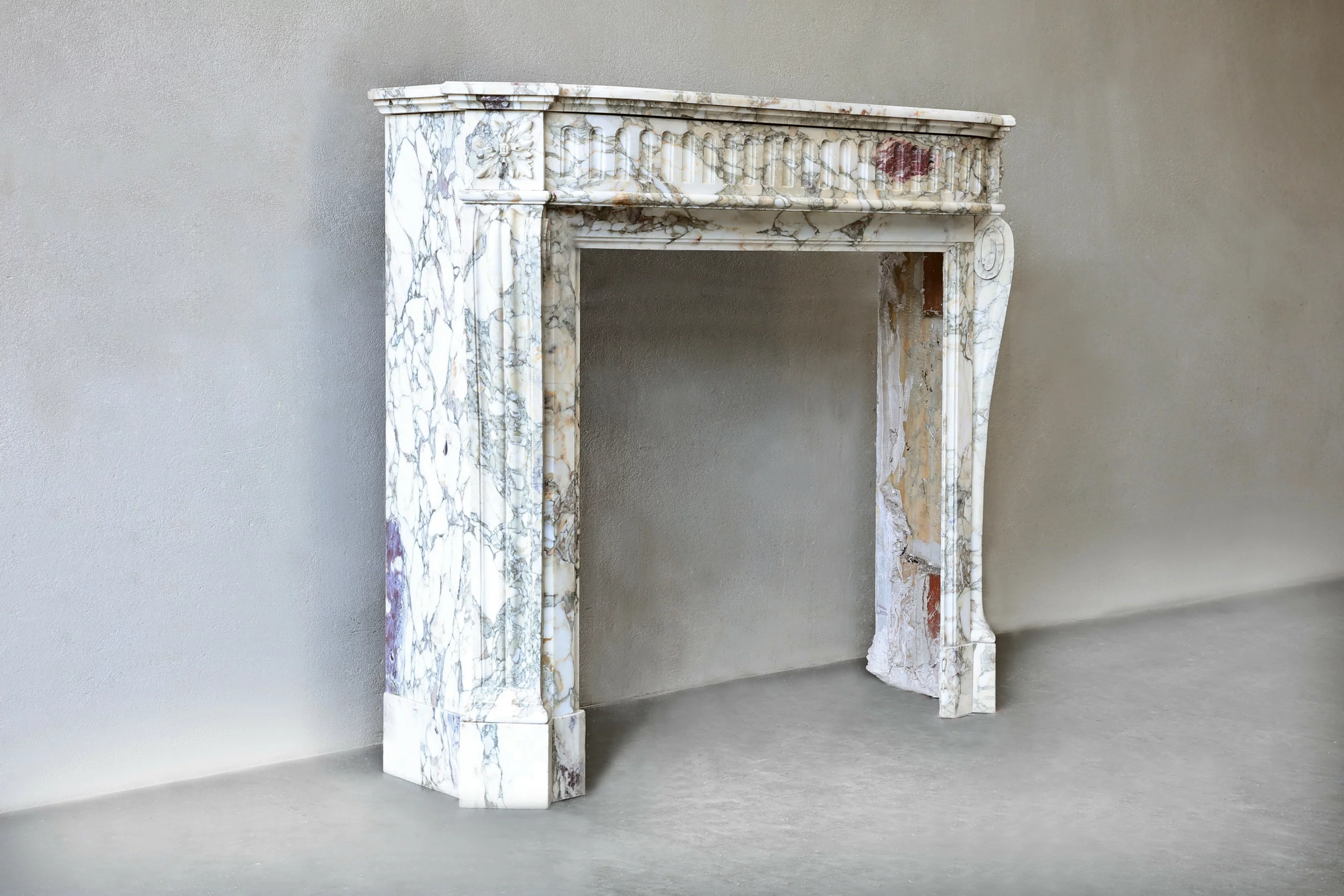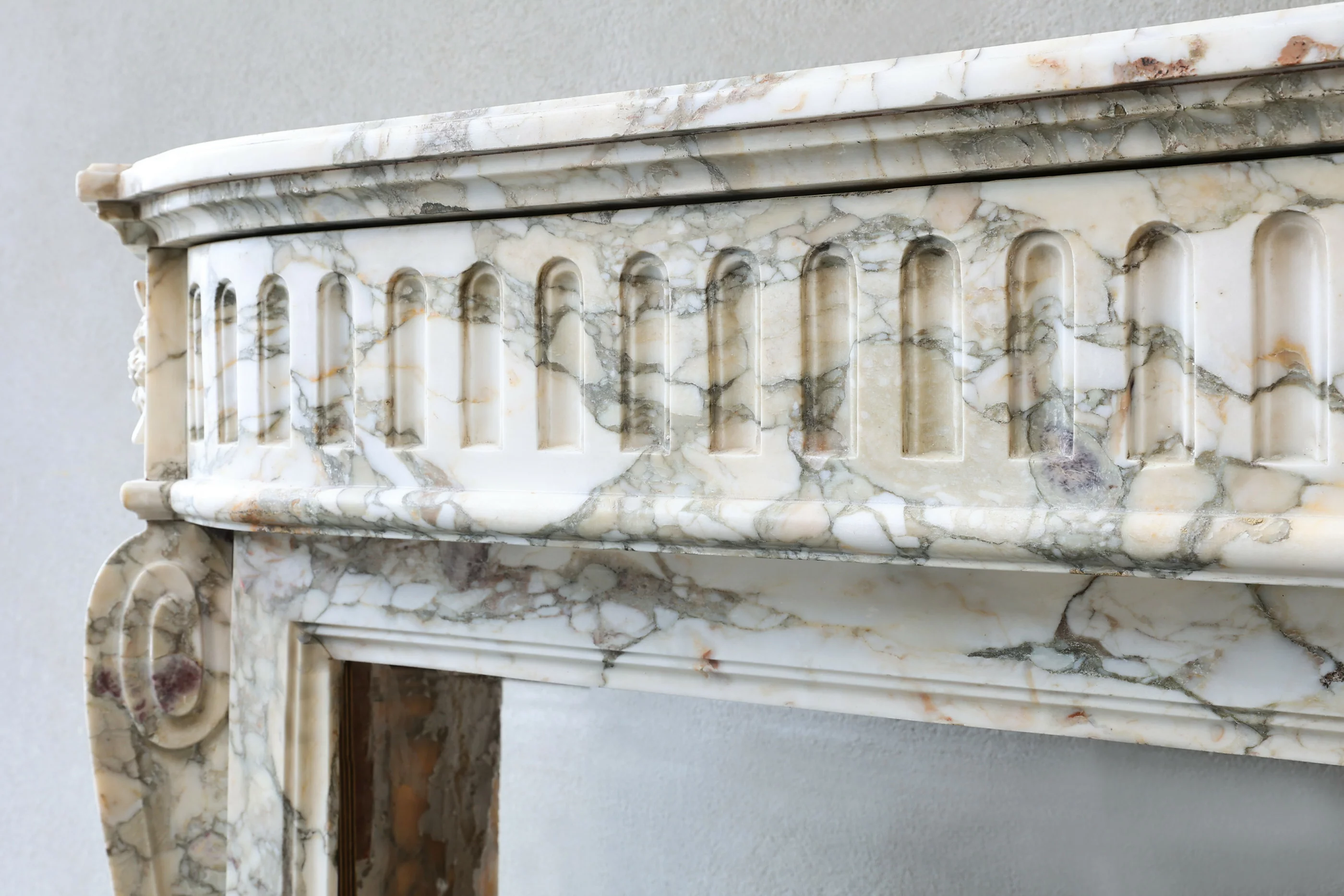 Beautiful antique mantel fireplace chimneypiece in marble Calacatta Viola. This type of marble has a neutral color with a warm color nuance of violet tones. This 19th Century chimneypiece is in the style of Louis XVI and has its provennce in Paris - France. The beautifull mantlepiece is decorated with ornaments, flutes and beautiful lines.