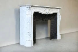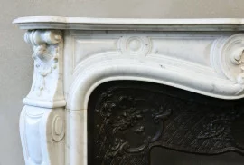 Beautiful antique mantel of Carrara marble in the style of Louis XV from the 19th century. This fireplace has a beautiful fitting cast iron insert, which makes the fireplace complete and special! This graceful fireplace has an elegant shell in the middle and on both sides of the legs! A very nice fireplace!