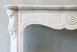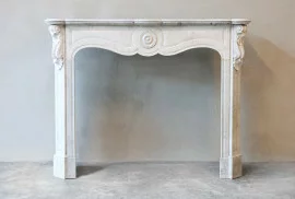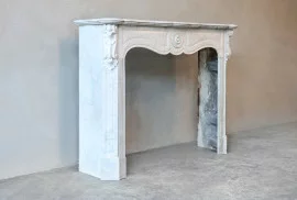 Beautiful friendly antique fireplace of Carrara marble from the 19th century. This fireplace is in Pompadour style and has beautiful ornaments in the front part and on the legs! The format is compact and suitable for many interiors.