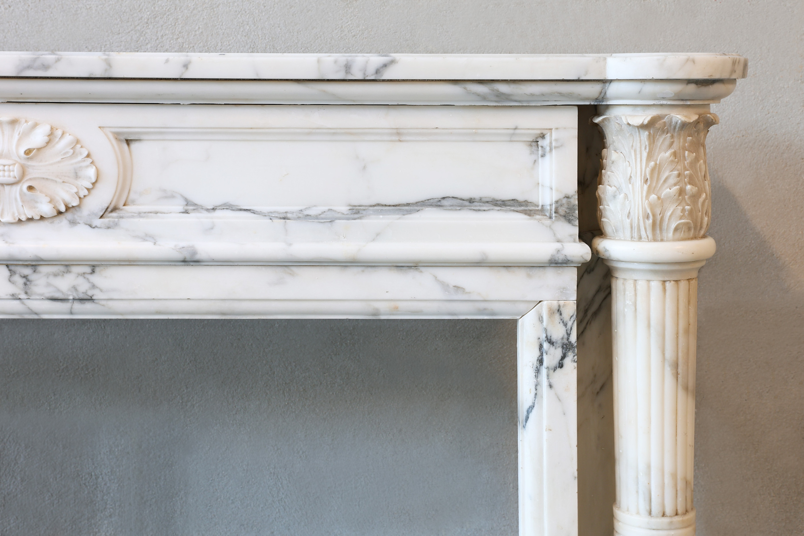 Beautiful antique chimneypiece in Arabescato marble from the 19th century in style of Louis XVI. This fireplace has a beautiful ornament in the middle of the front part and at the top of the legs. The flutes on the legs also gives this antique 19th century chimneypiece style ansd allure. The white Arabescato marble with light gray veins gives the fireplace allure! A special mantle surround in our collection.