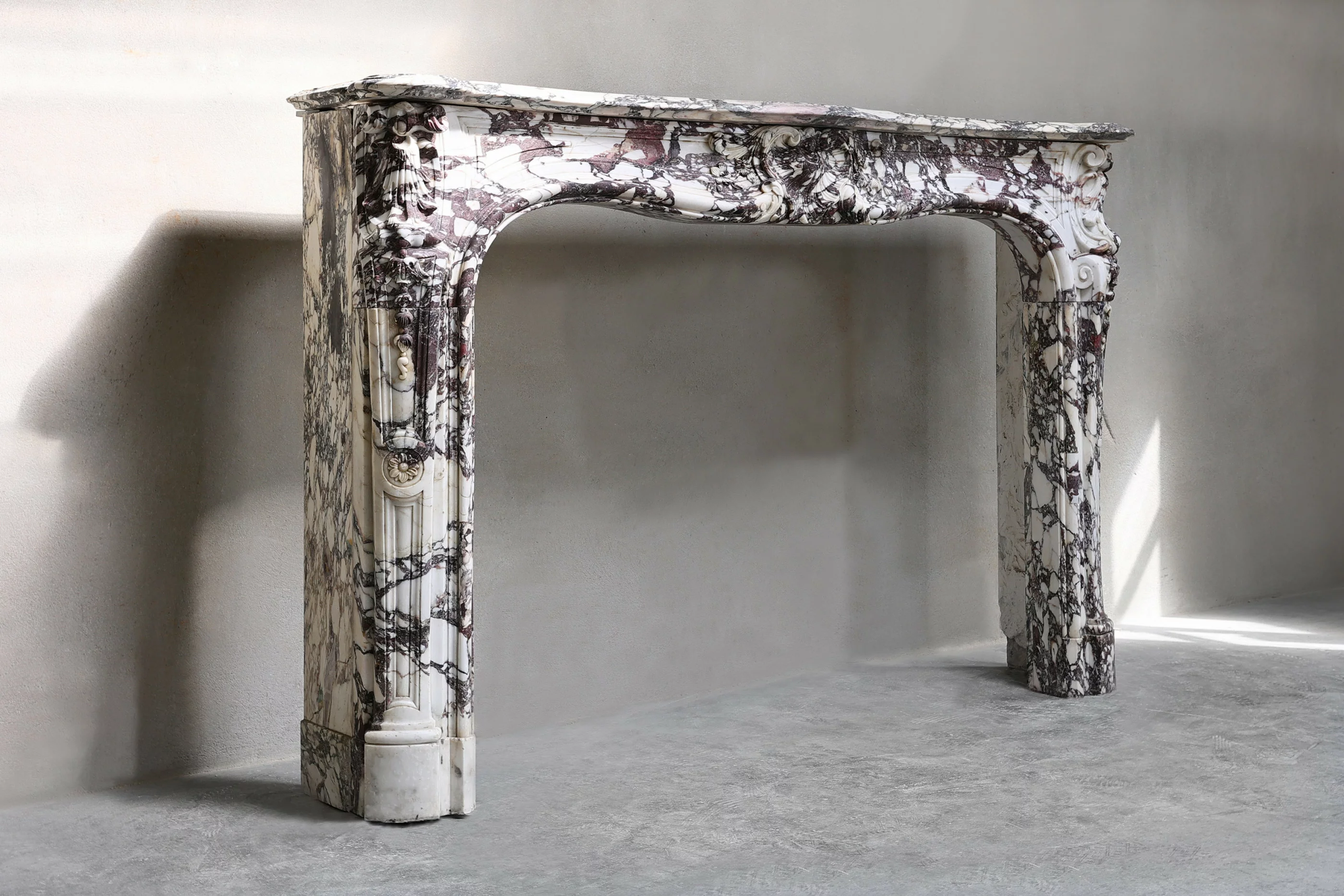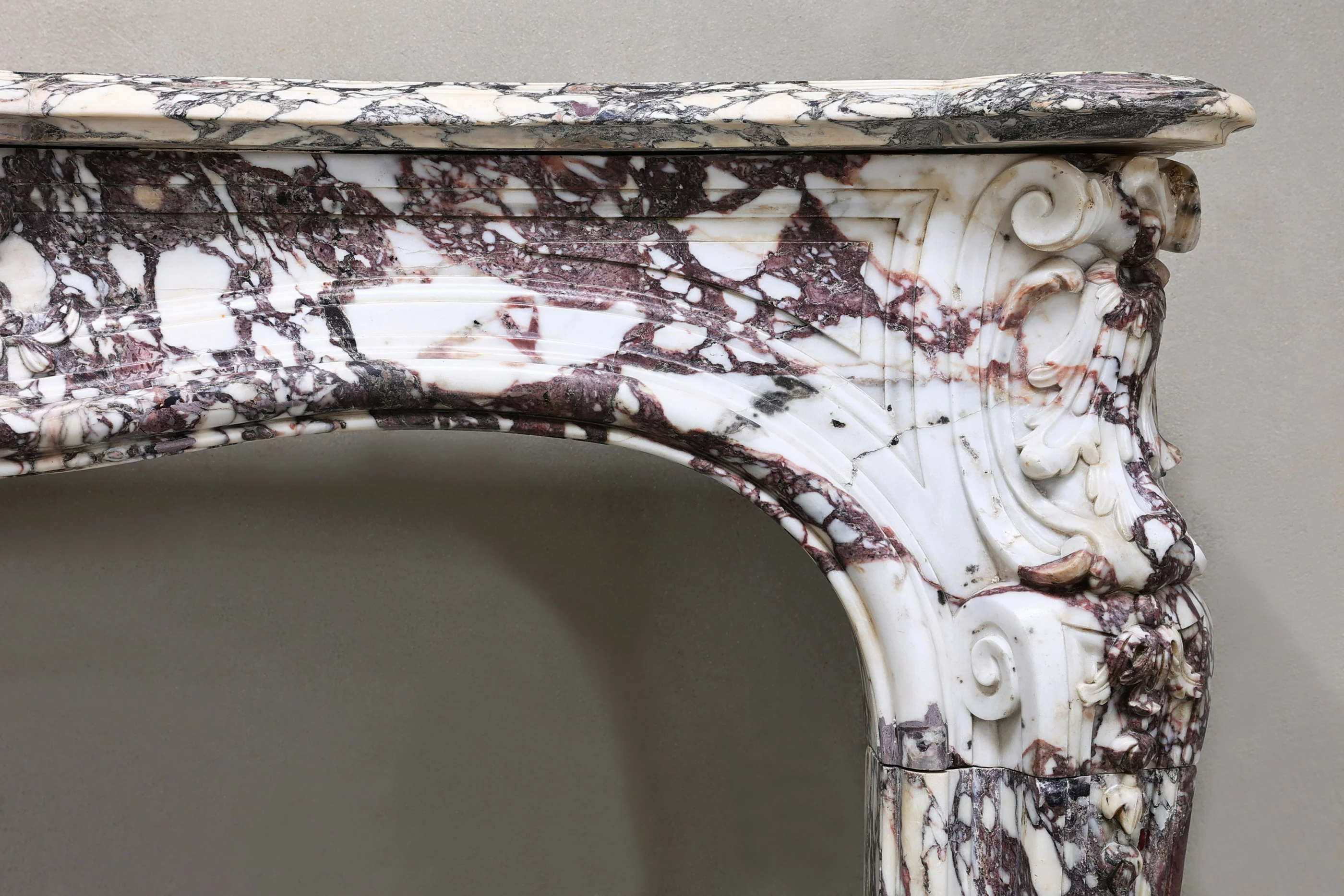 Beautiful colorful antique fireplace of the exclusive marble type Breccia Violetta. This fireplace dates from the 18th century and is in the style of Louis XV. A special mantle with a chic look and warm color nuance. This fireplace is equipped with various ornaments such as a scallop in the middle of the front part and on the legs. A beautiful fireplace within our extensive collection!
