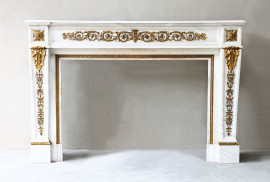 Very chic antique fireplace of Carrara marble with gilded gold. An elegant fireplace with beautiful ornaments and decorations in gilded gold in the front part and continuing on the legs. This 19th century fireplace is in the style of Louis XVI and we have taken it from an apartment in Paris and is an asset to our collection of antique fireplaces.