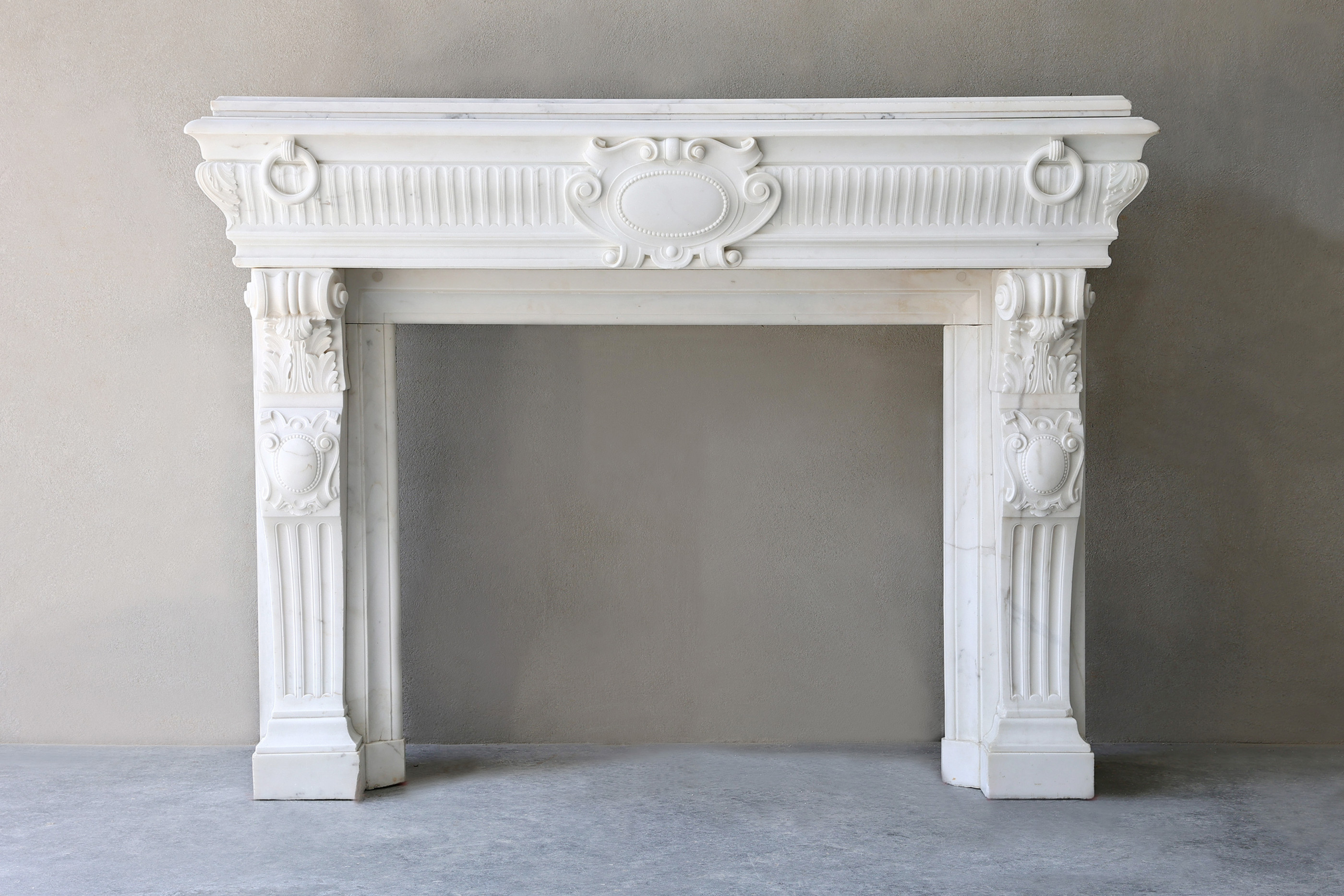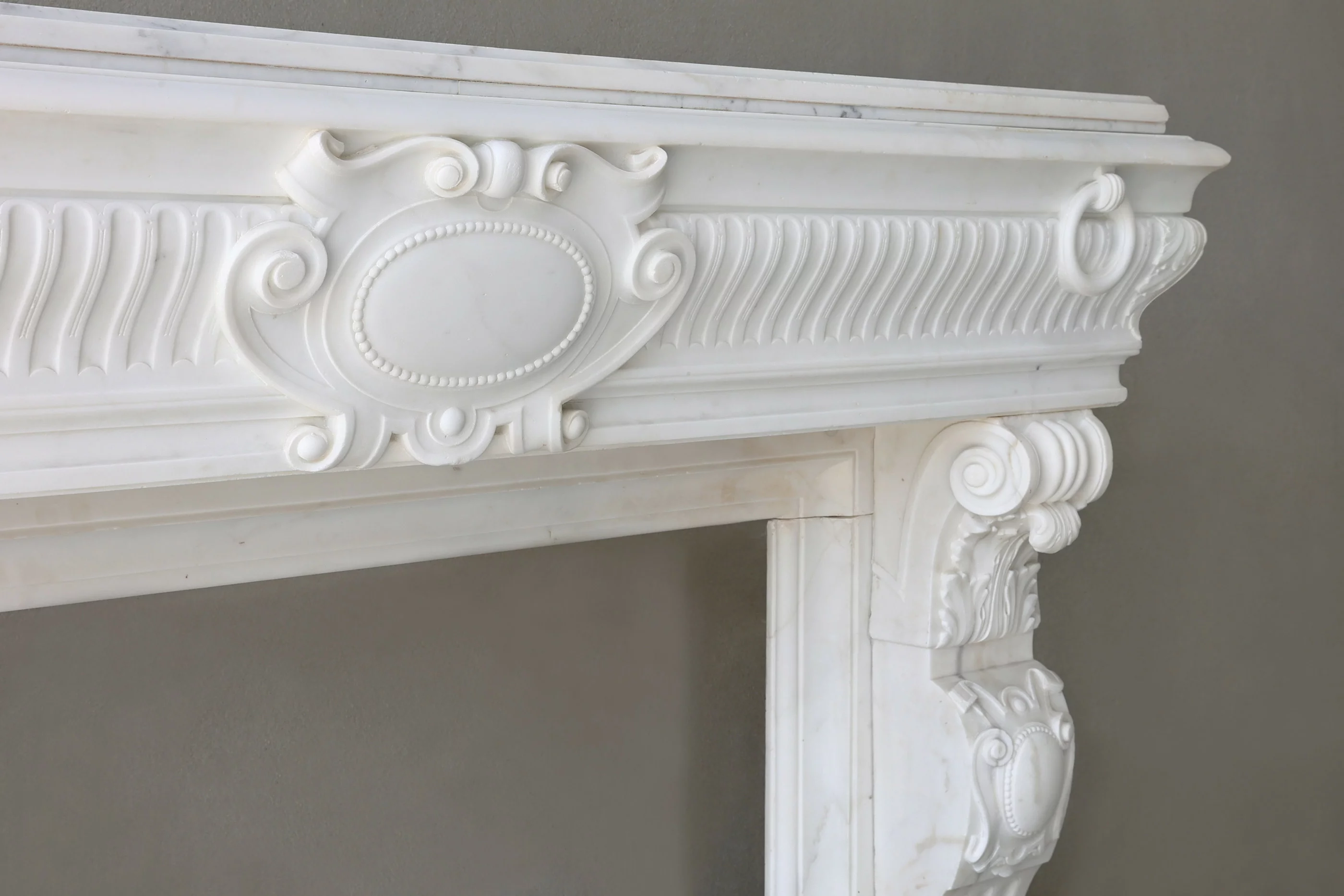 This is an antique marble fireplace mantel from the 20th century, crafted from white Carrara marble. It is executed in Neoclassical style, recognizable by its symmetrical lines, fluting, scrolls and elegant cartouches.