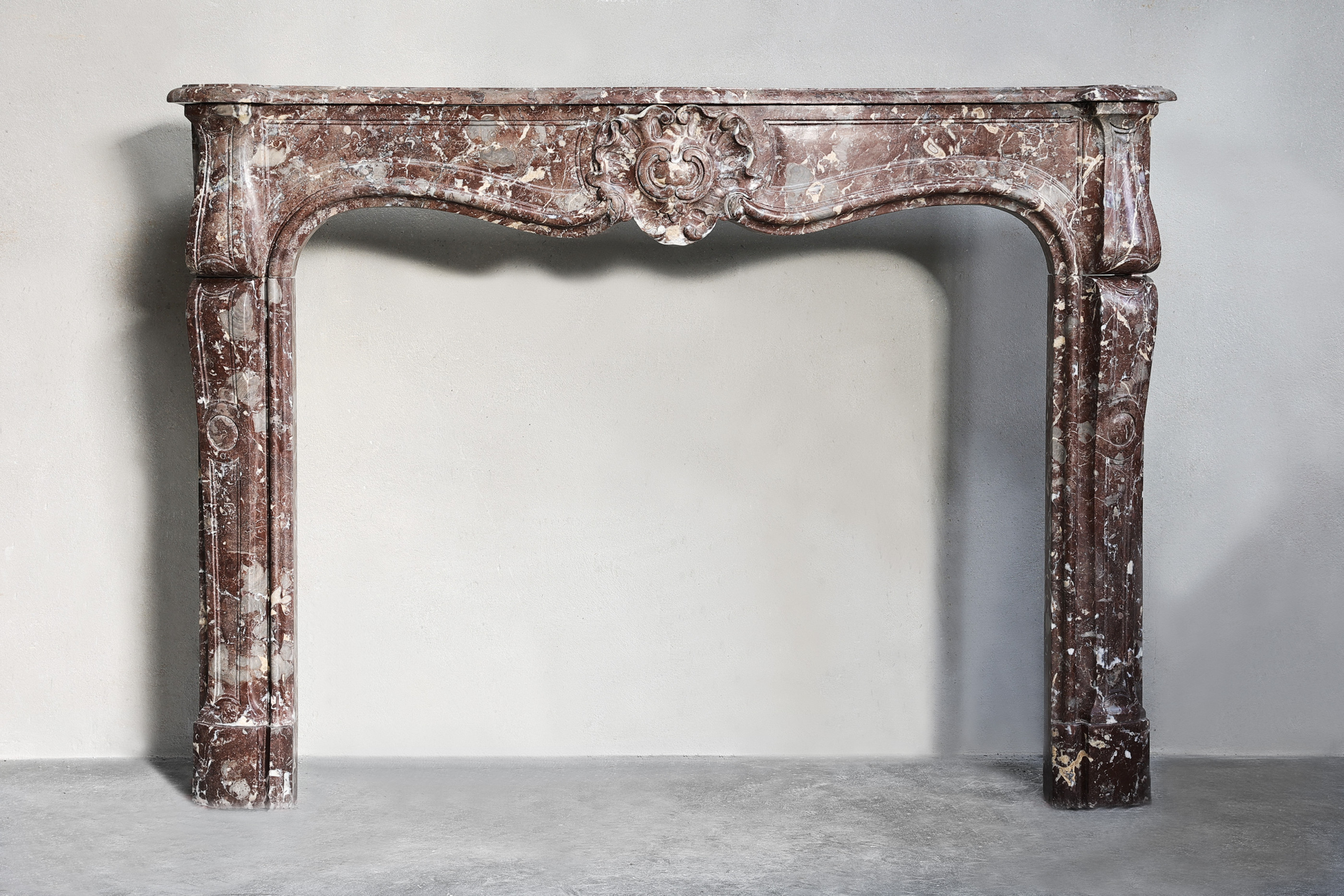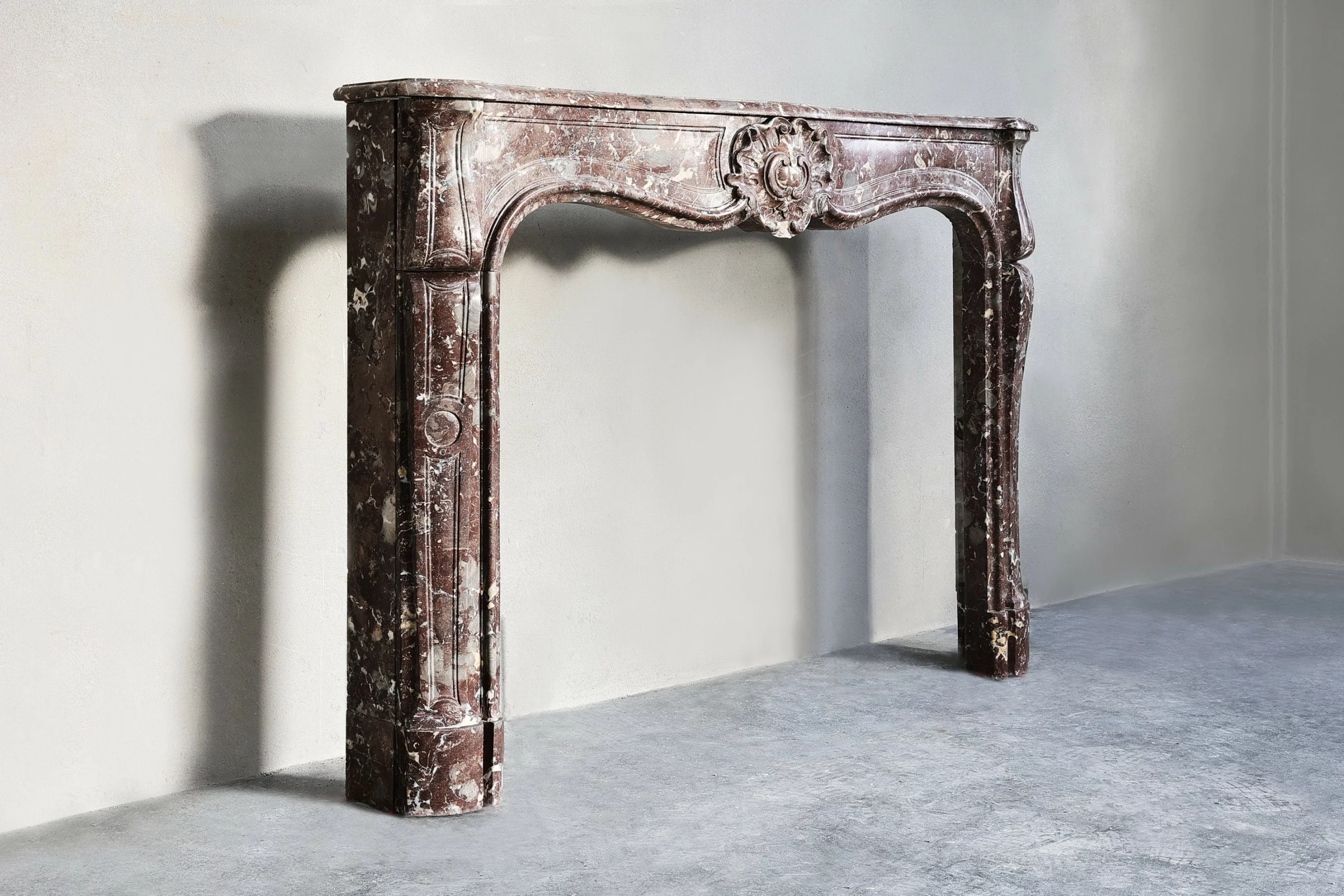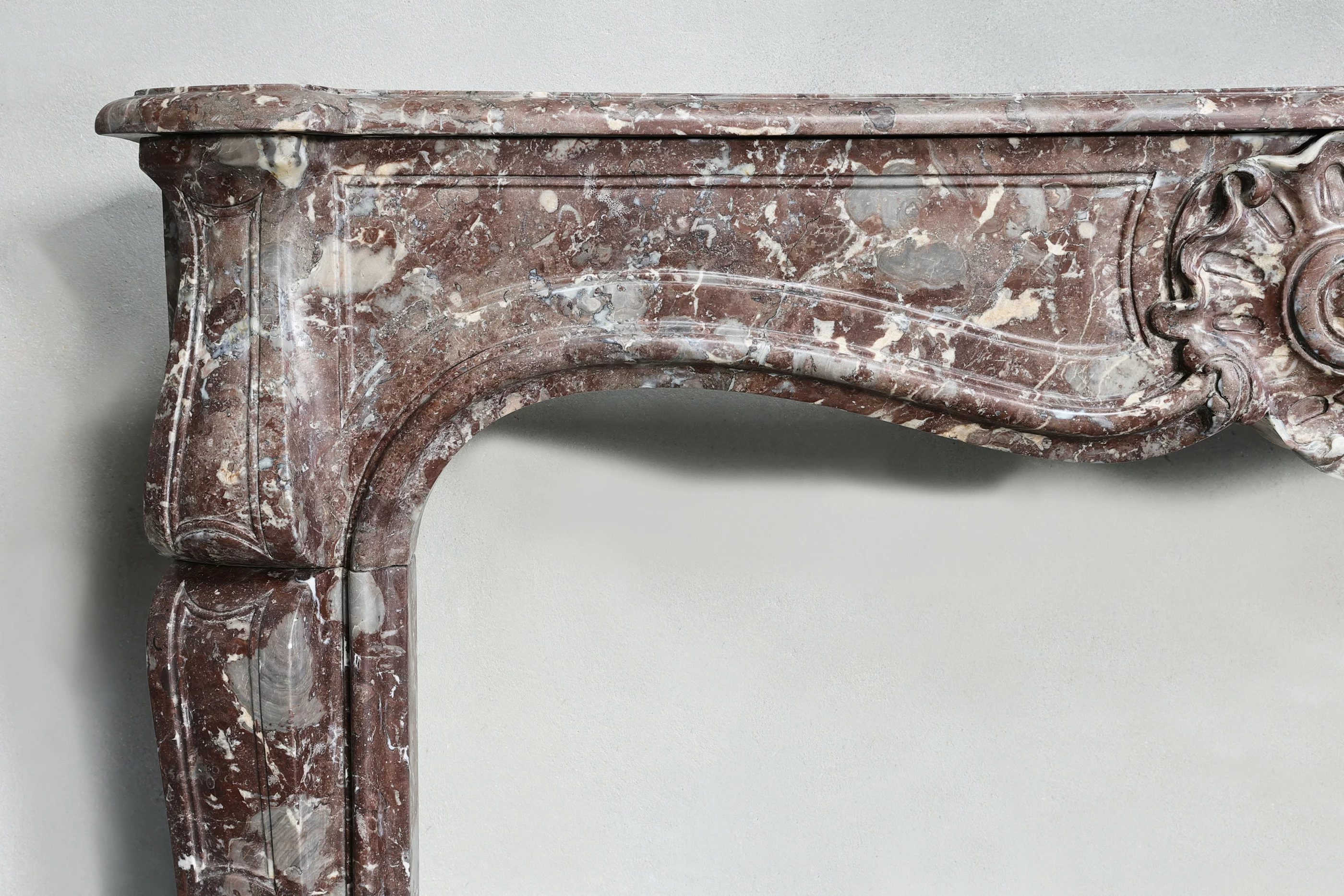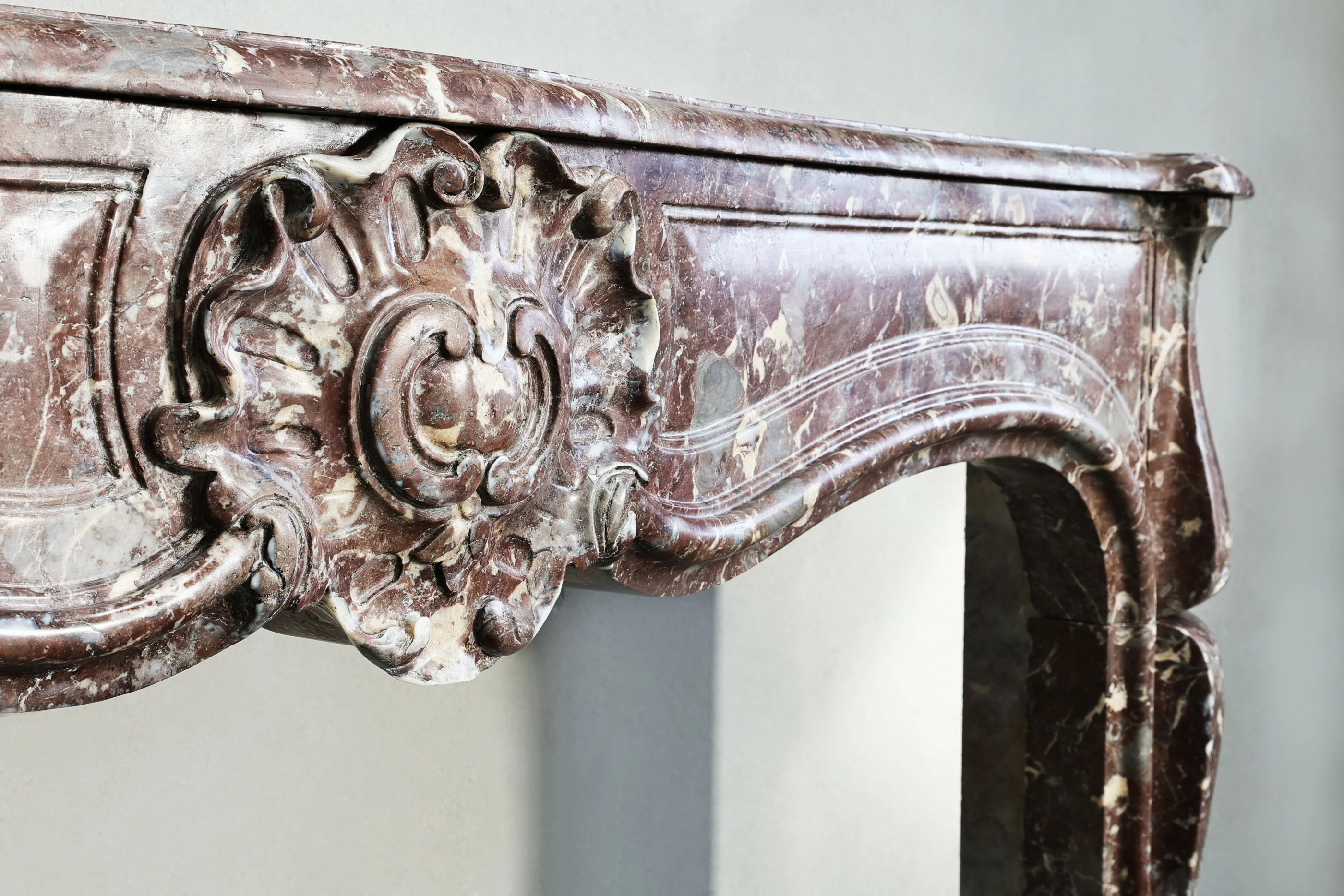 Elegant mantelpiece made of warm Rouge Royal marble in the style of Louis XV from the 19th century! This charming and graceful mantelpiece has a beautiful scallop in the center and beautiful lines. An antique mantelpiece with a warm color nuance and light veins!