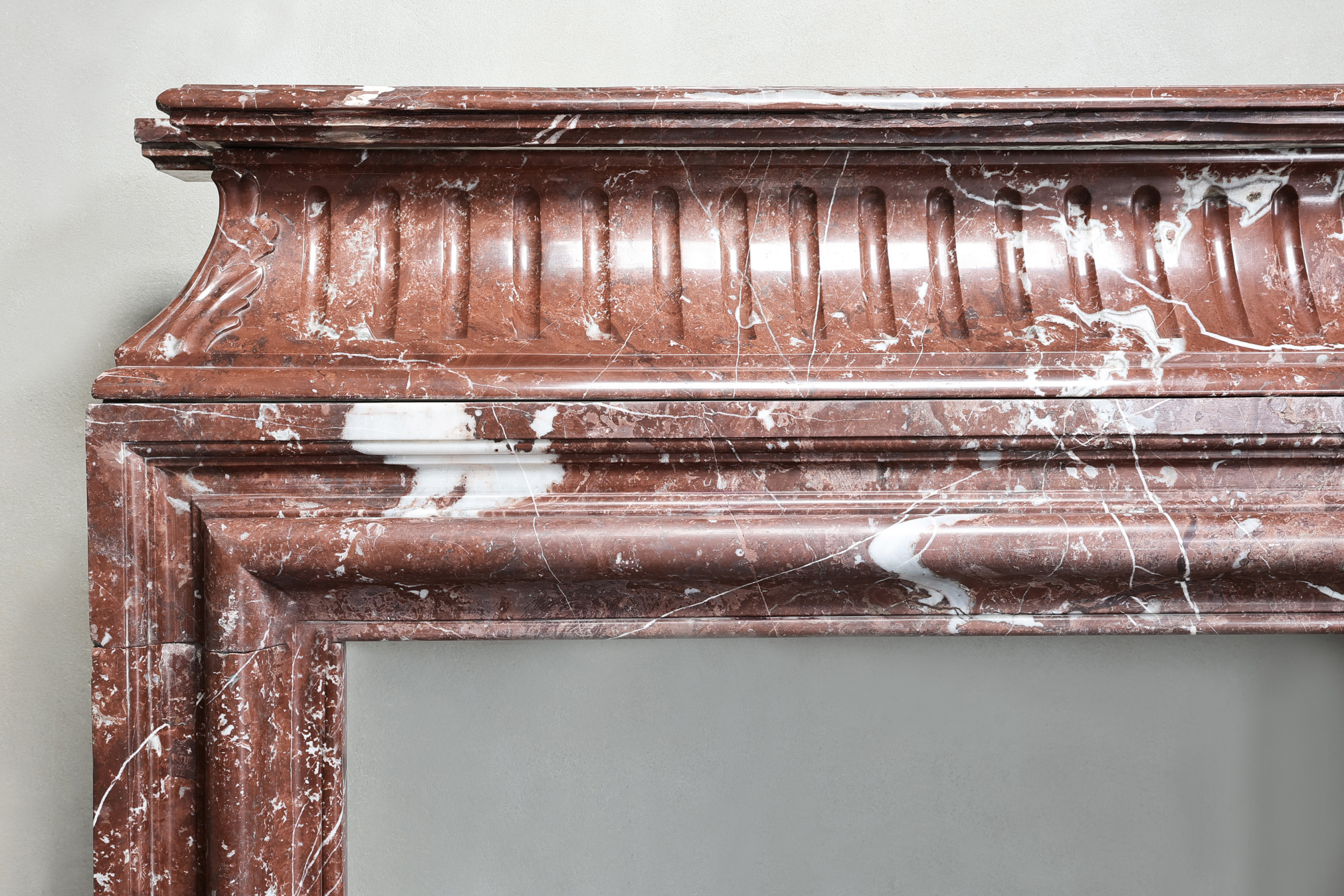 Beautiful antique mantelpiece made of Rouge Royal marble. This warm color scheme creates a lot of atmosphere and appearance! A unique fireplace within our collection from the 19th century in the style of Louis XVI.