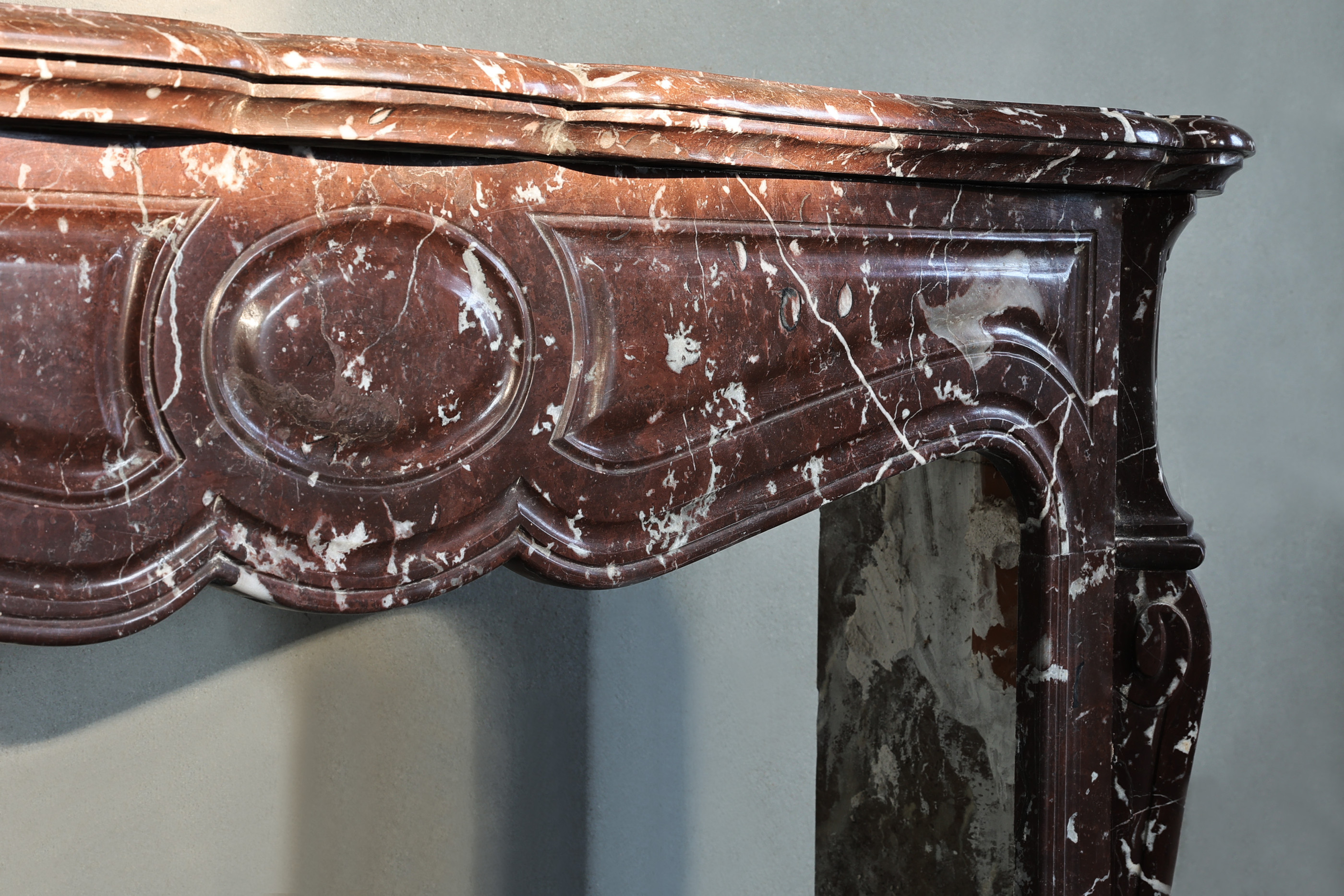 This antique marble fireplace mantel, a stunning example of French design, originates from Paris, France. Crafted between 1860 and 1880, this Pompadour-style marble chimneypiece showcases the elegance and refinement of 19th-century craftsmanship. Made from luxurious Griotte Rouge marble, its intricate detailing and deep red hues are sure to elevate any space.