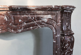 This antique marble fireplace mantel, a stunning example of French design, originates from Paris, France. Crafted between 1860 and 1880, this Pompadour-style marble chimneypiece showcases the elegance and refinement of 19th-century craftsmanship. Made from luxurious Griotte Rouge marble, its intricate detailing and deep red hues are sure to elevate any space.