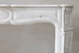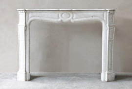 A unique set of two identical Carrara marble fireplaces! These two mantelpieces are in Pompadour style, characterized by the round ornament in the center of the front part. A very rare combination from the 19th century that would fit perfectly into your interior!