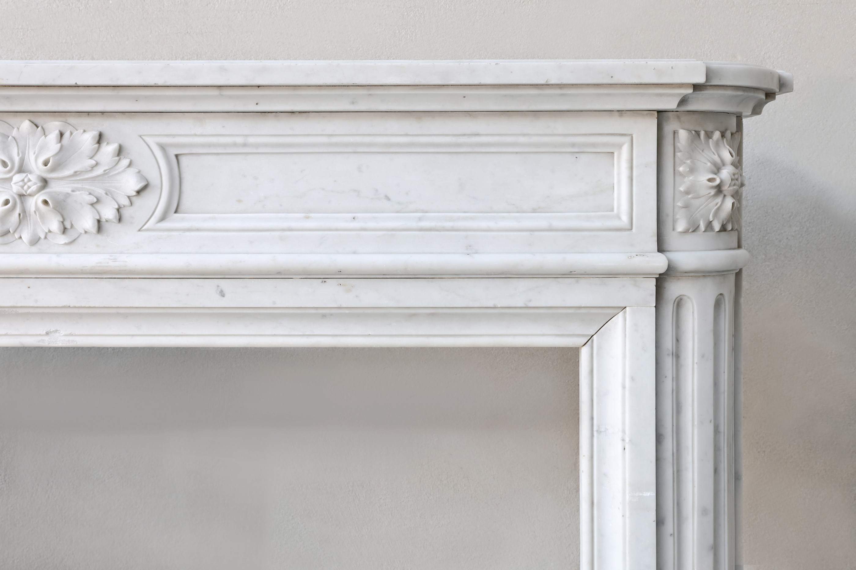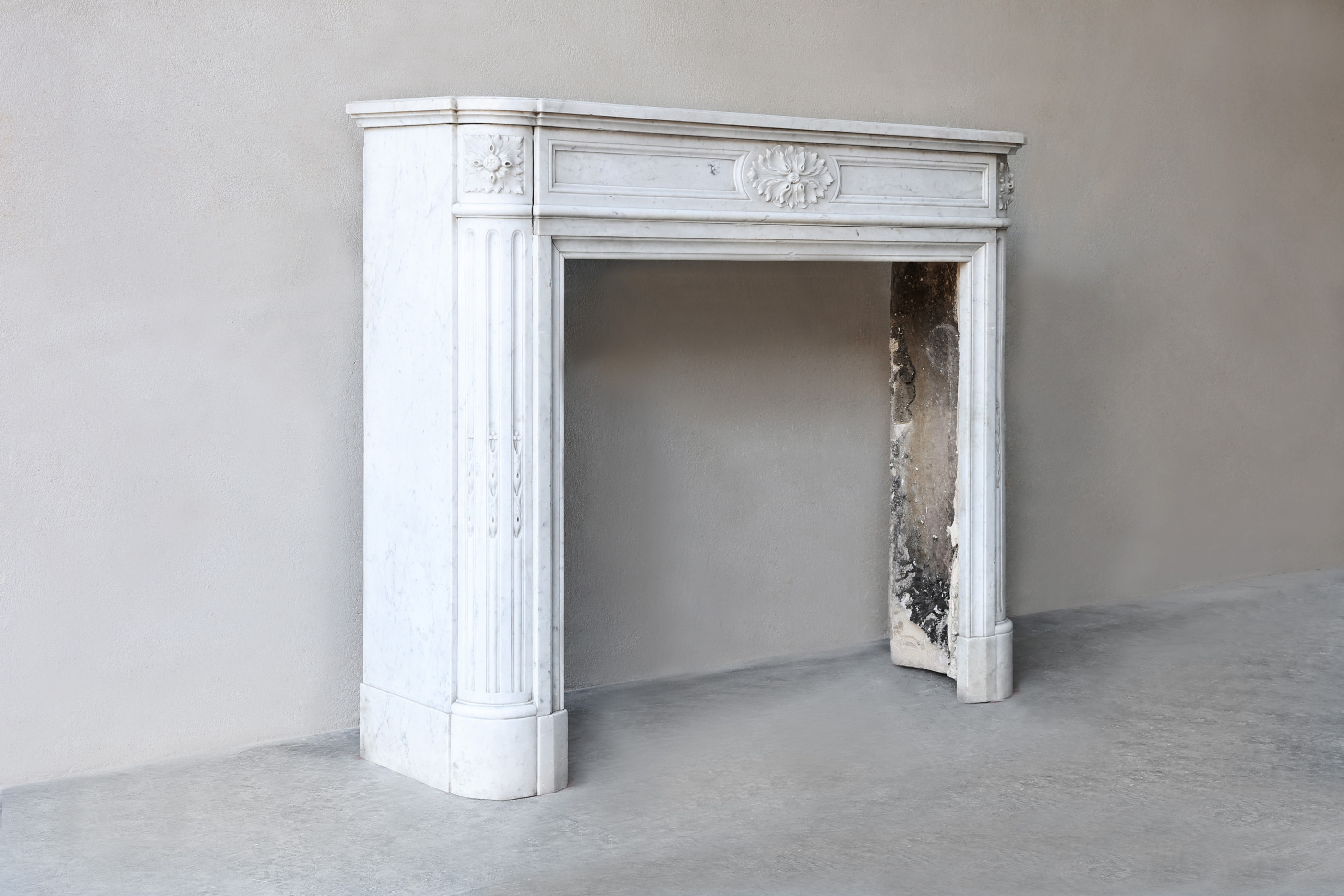 Beautiful compact mantelpiece of Carrara marble from Italy. An elegant antique fireplace with ornaments in the middle on the legs and round shapes! This authentic mantelpiece is in the style of Louis XVI and exudes history and warmth. The size makes this mantelpiece suitable for many interiors.