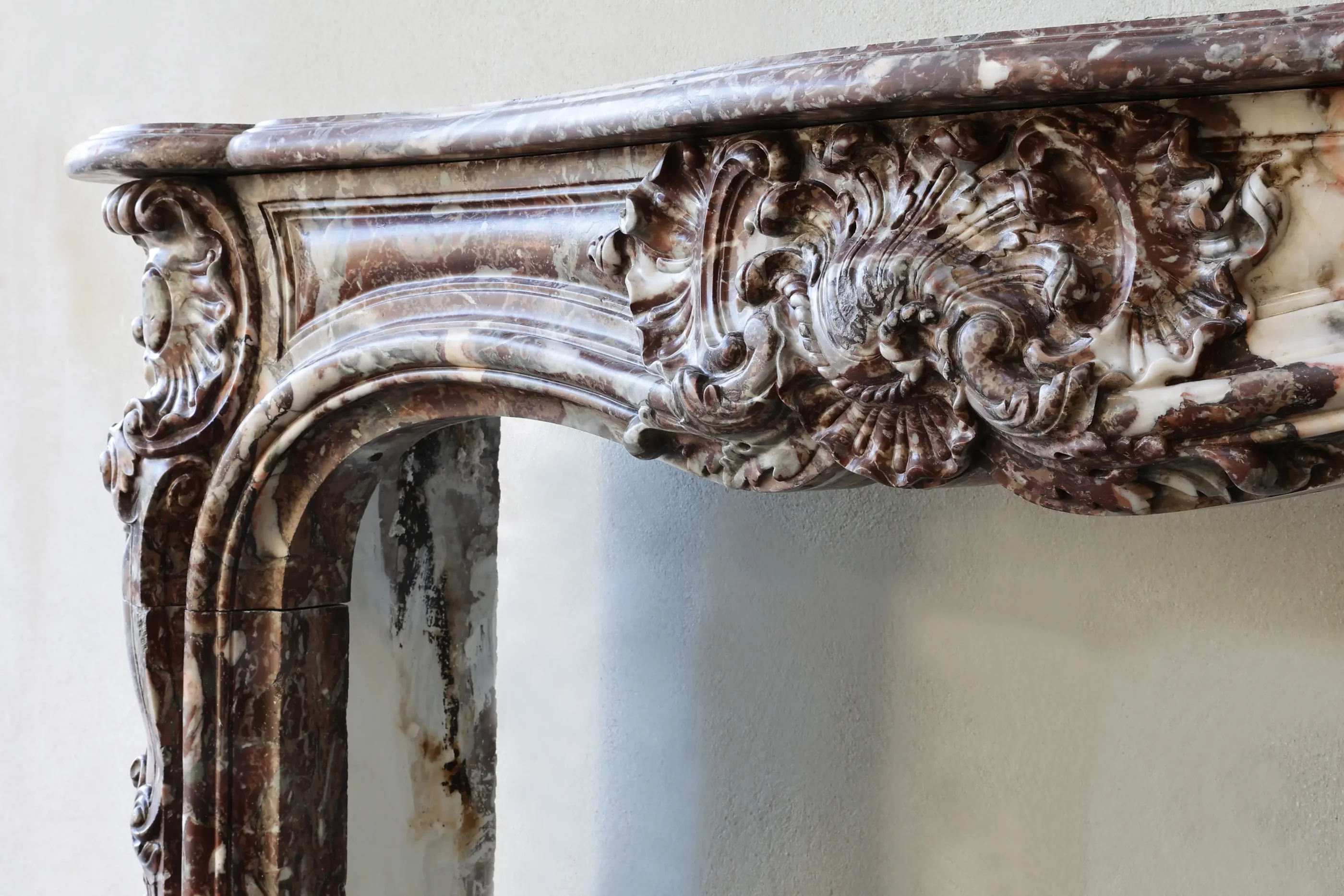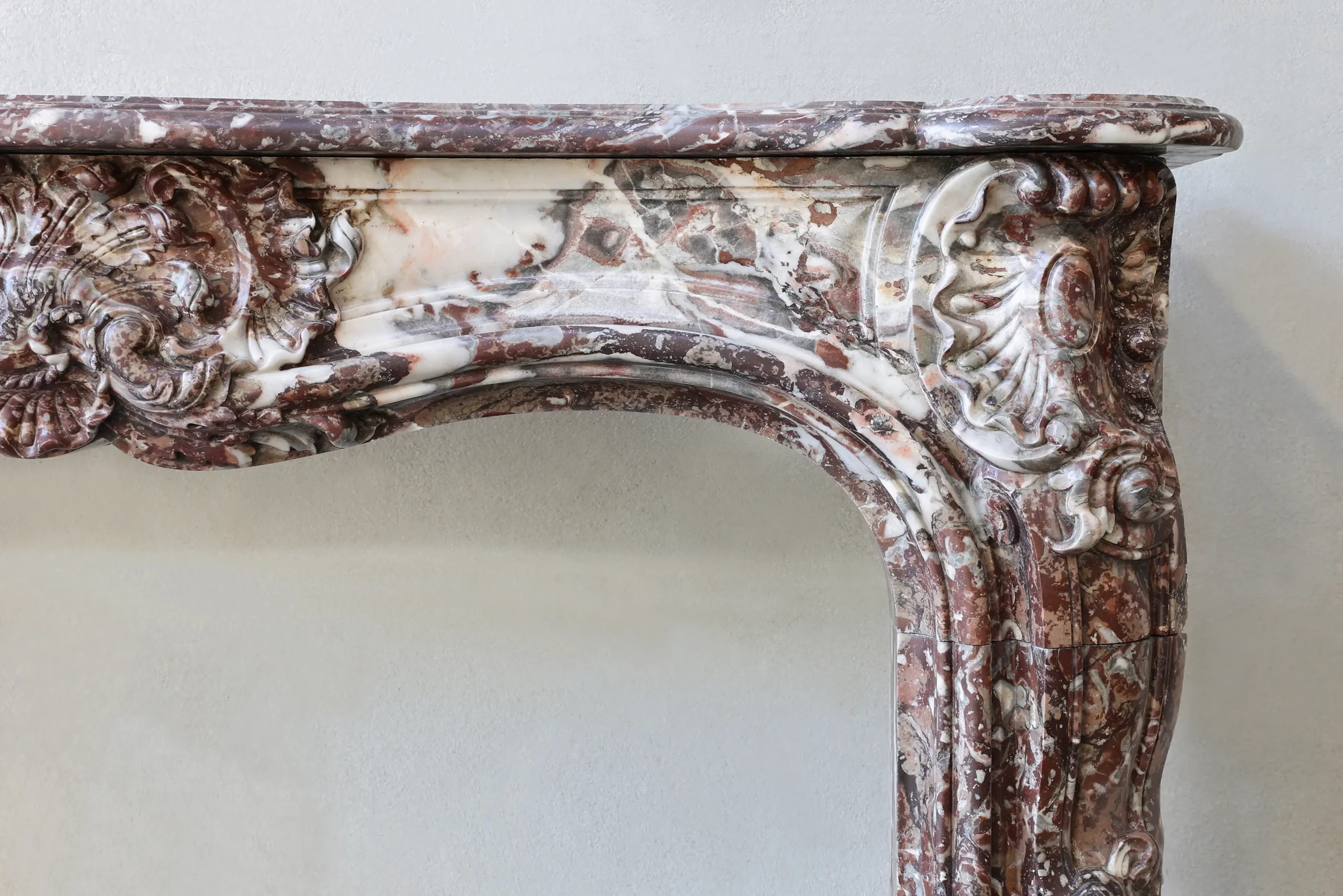 This antique fireplace surround is made from solid, naturally veined marble with a red and cream colour palette. The piece consists of a profiled mantel shelf, a softly arched opening, and carved uprights. It is fully carved from stone and intended as a permanent architectural feature within an interior or restoration project.