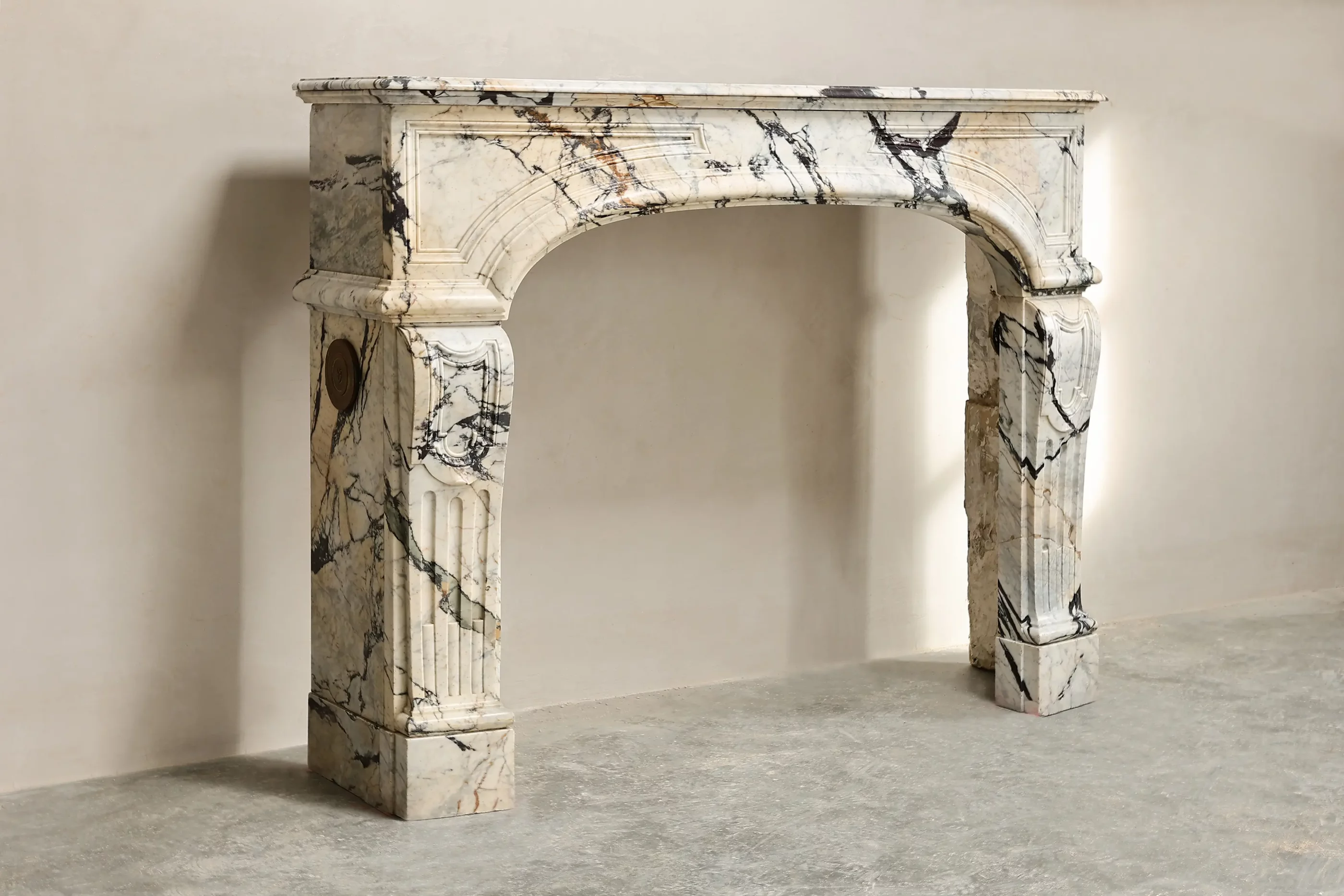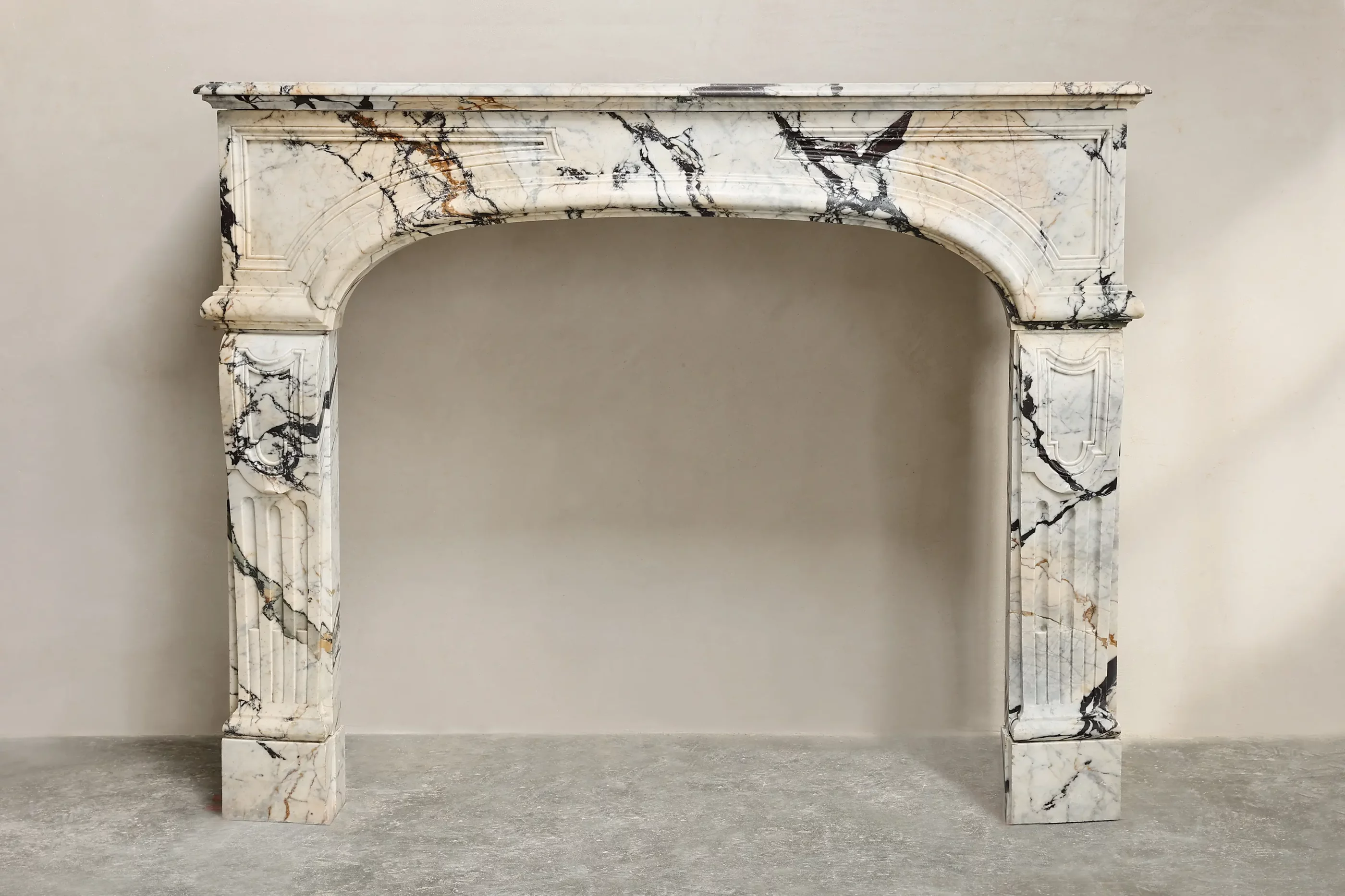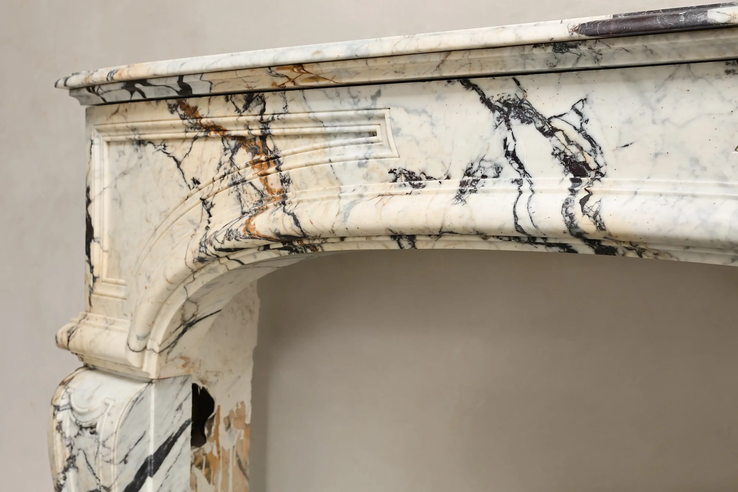 Elegant antique fireplace crafted from exclusive Paonazzo marble, originating from France. This marble is distinguished by its white background with striking black and purplish-brown veining, giving each fireplace a unique and vibrant character. Executed in the prestigious style of Louis XIV, the design is characterized by strong proportions, clean lines, and a classic, monumental appearance. There was a small fracture in the right leg, but this has been expertly restored and is barely visible.