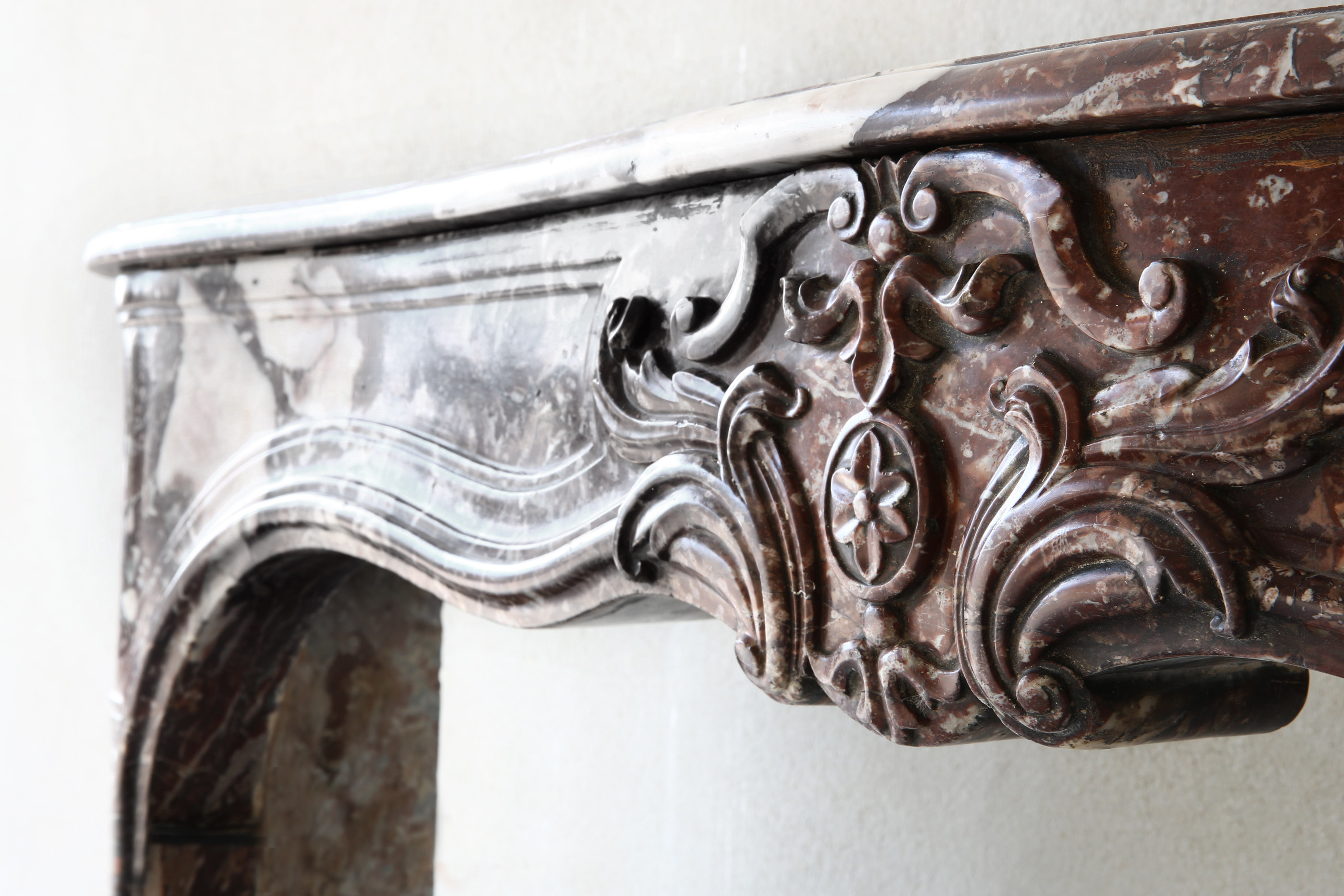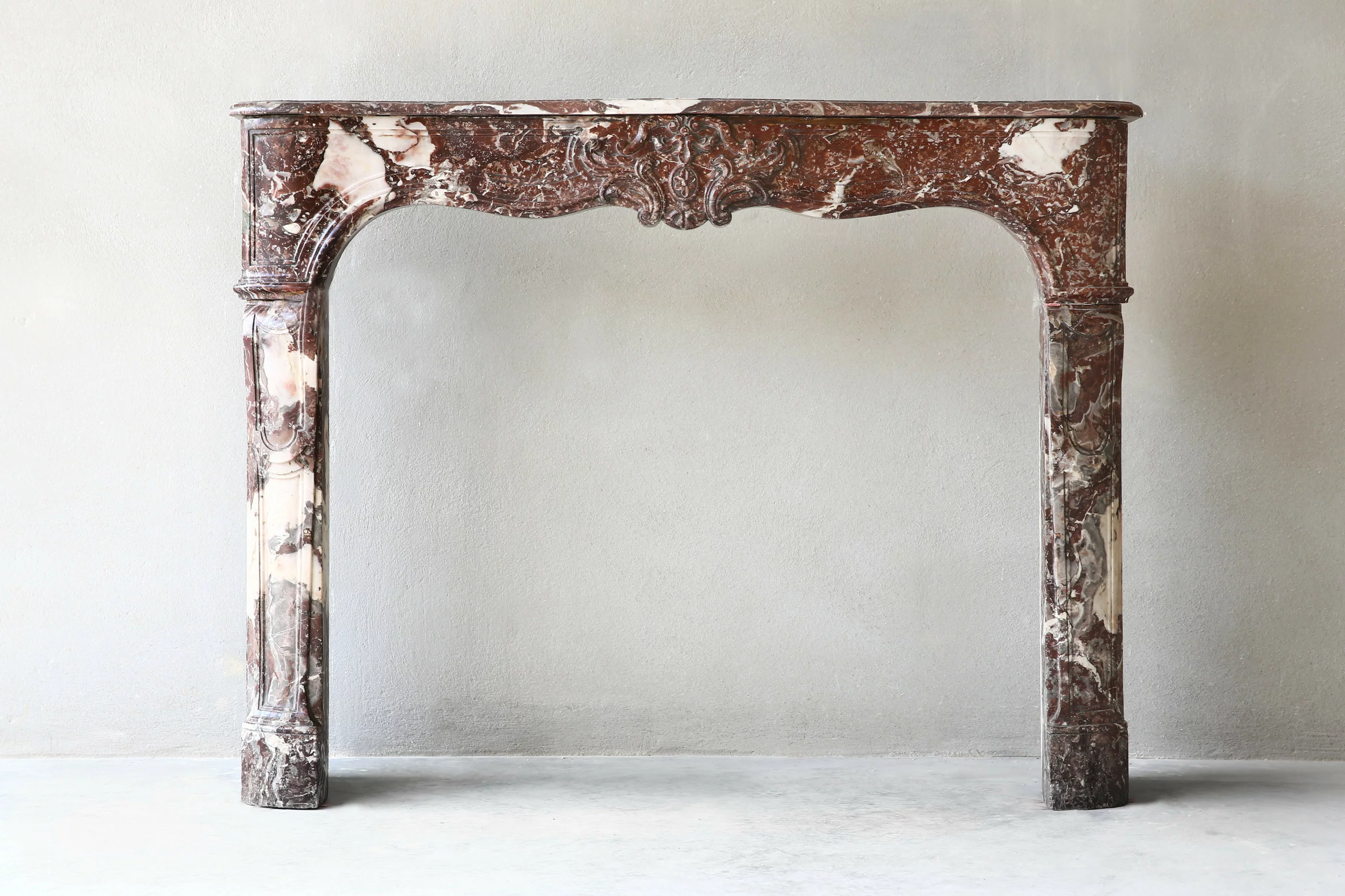 Very nice antique marble fireplace from the era of Louis XV. This marbled variety is Griotte rouge de Belgique and has a beautiful hue of warm brown/red shades. Recently we found this fireplace in Brussels. Approximately 150 antique fireplaces are set up in our warehouse.