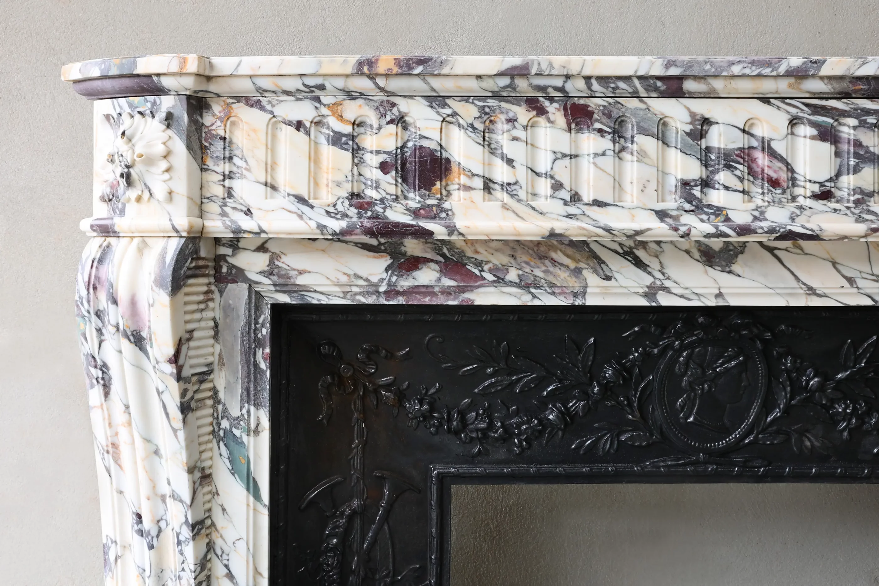 This 19th-century Louis XVI fireplace in Brèche Violetta marble is a cleanly designed and representative piece, characterized by high-quality materials and classic detailing. The marble features distinct purple, grey, and cream veining, giving it a strong and recognizable appearance. The cast-iron insert is original and decorated with reliefs typical of the Louis XVI period.