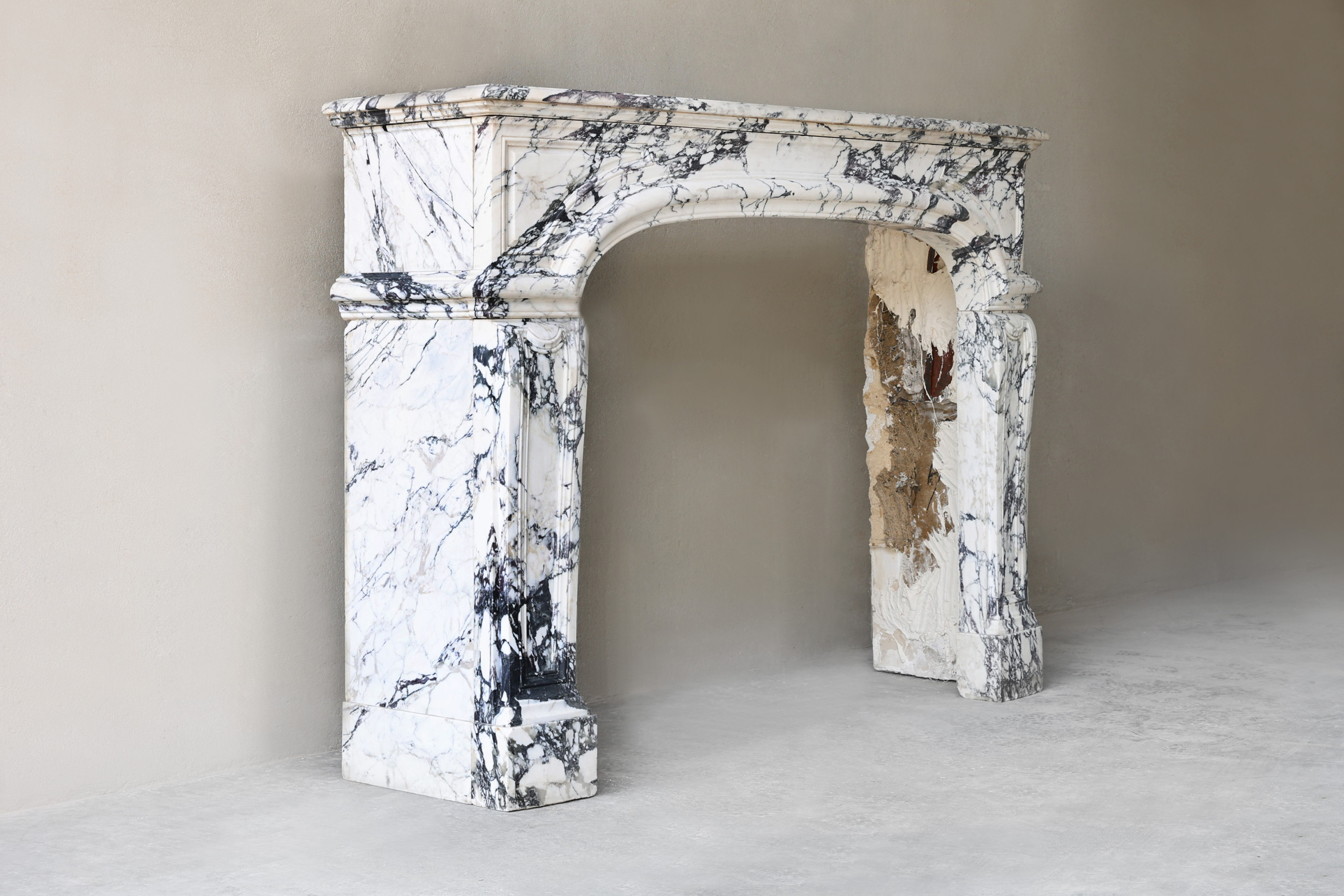 There is something undeniably captivating about an original antique fireplace mantel, especially one crafted from a rare and beautiful marble. This particular chimneypiece is a one-of-a-kind 19th century treasure, carved from Paonazzo marble – a snow-white stone streaked with dramatic blue-purple veins. Originally gracing a stately 1800s residence in Paris’ historic Le Marais district, this antique marble mantel embodies the elegance and grandeur of a bygone era while remaining a timeless centerpiece for today’s interiors.