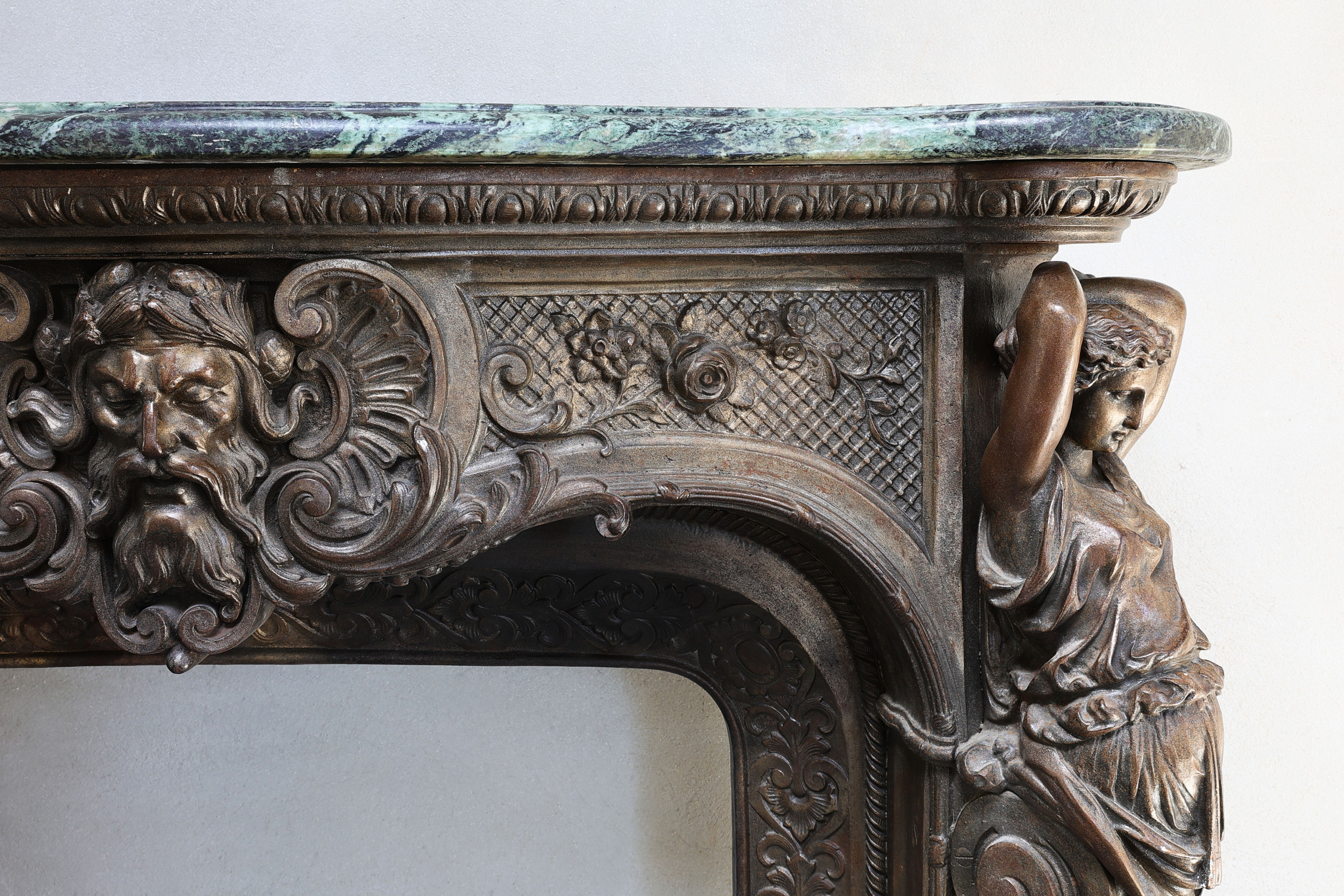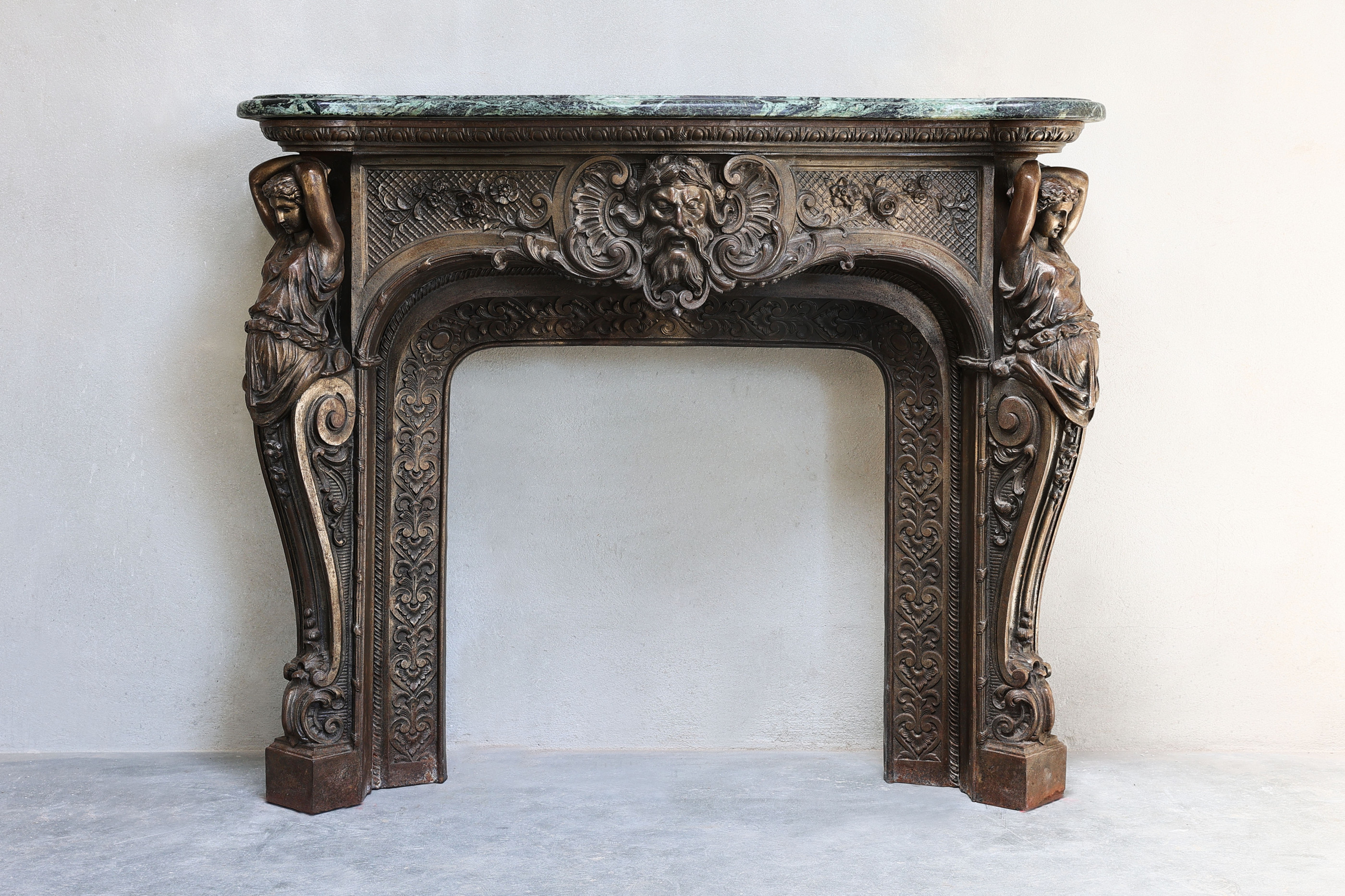 Very unique and rare antique marble fireplace of cast iron bronze patina and Vert de Gréce marble (Tinos) from the mid-19th century fireplace! The faces come from Greek mythology. In the center you see Poseidon, the God of the Sea and the statues on the sides is his wife Amphitrite. A very special fireplace that deserves a nice place in an interior.