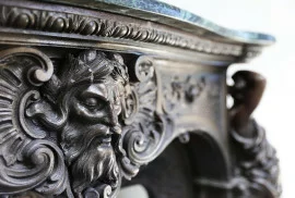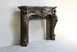 Very unique and rare antique marble fireplace of cast iron bronze patina and Vert de Gréce marble (Tinos) from the mid-19th century fireplace! The faces come from Greek mythology. In the center you see Poseidon, the God of the Sea and the statues on the sides is his wife Amphitrite. A very special fireplace that deserves a nice place in an interior.
