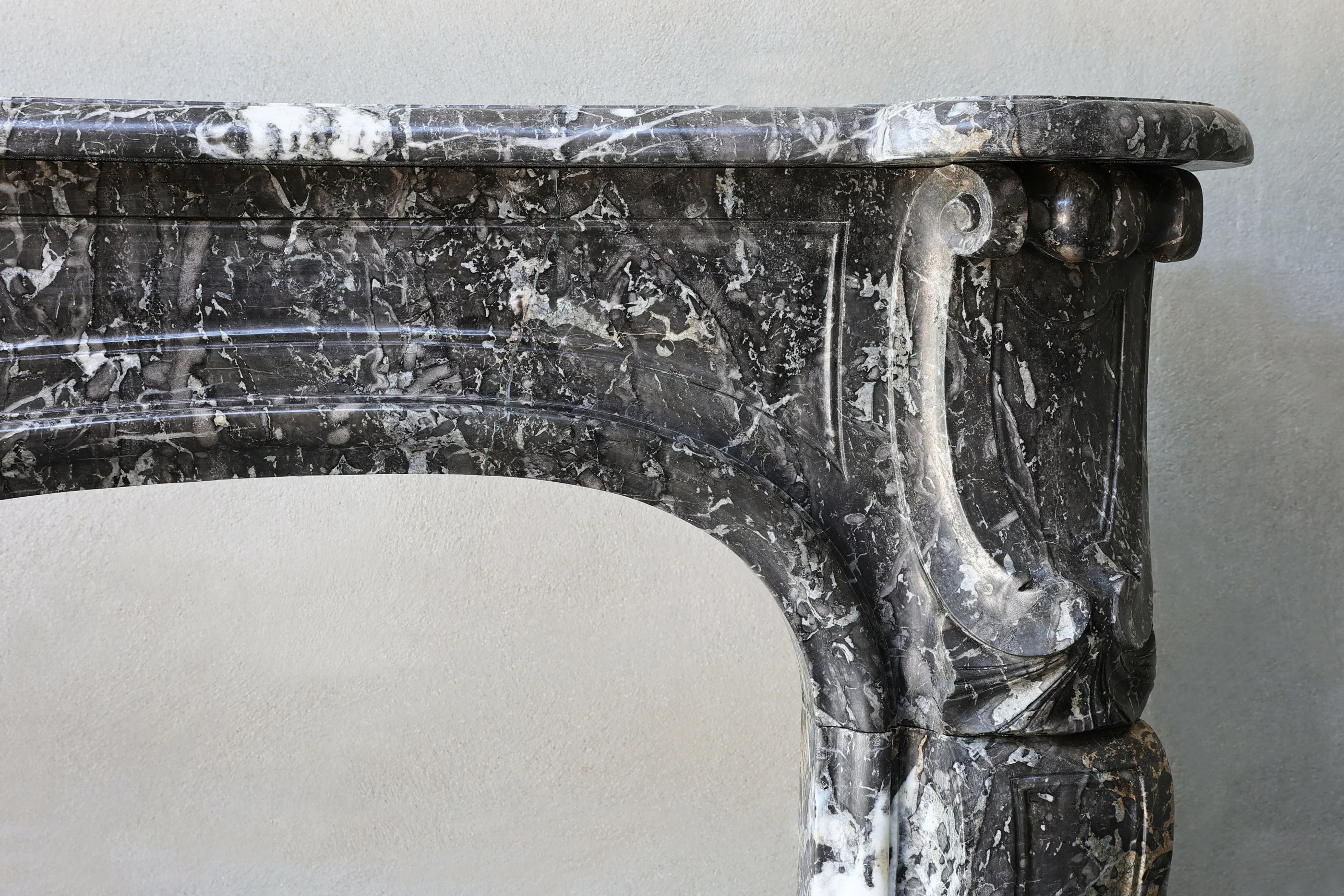 Beautiful chic antique fireplace of Sint Anna marble, a beautiful rustic kind of marble with light veins. This fireplace is in the style of Louis XV and dates from the 18th century. The beautiful veins and ornate ornaments make this fireplace charming.