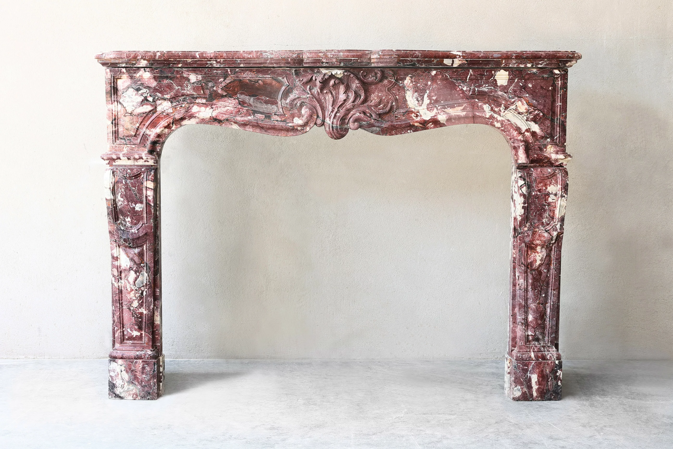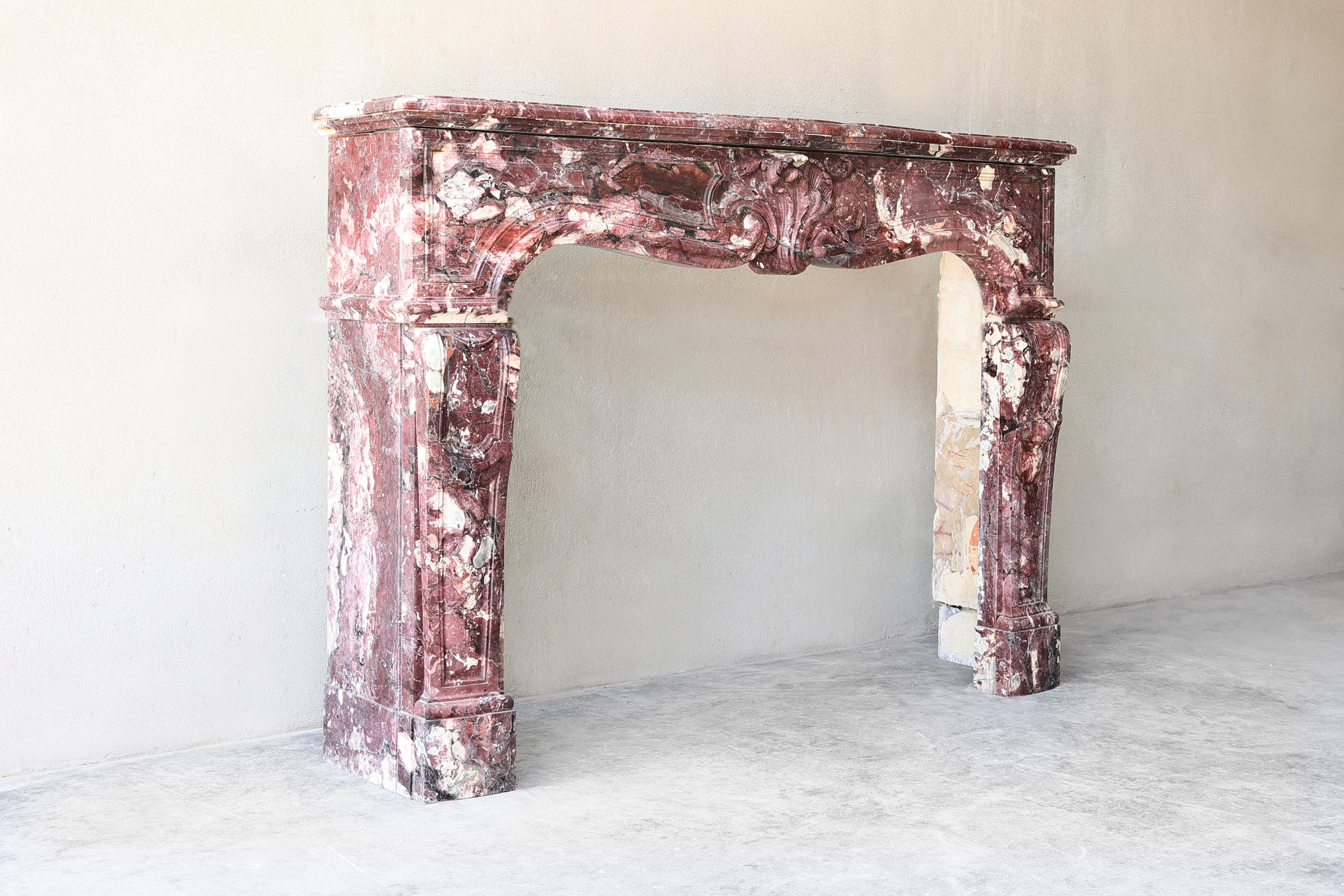 Very special antique fireplace of the rare type of Fleur de Peche marble. A type of marble that stands out because of its color and therefore belongs to the unique fireplaces! This fireplace dates from the 18th century and is in the style of Louis XV. The front part has a scallop and beautiful lines that also continue on the legs! This fireplace has had some restorations, but these have been expertly restored!