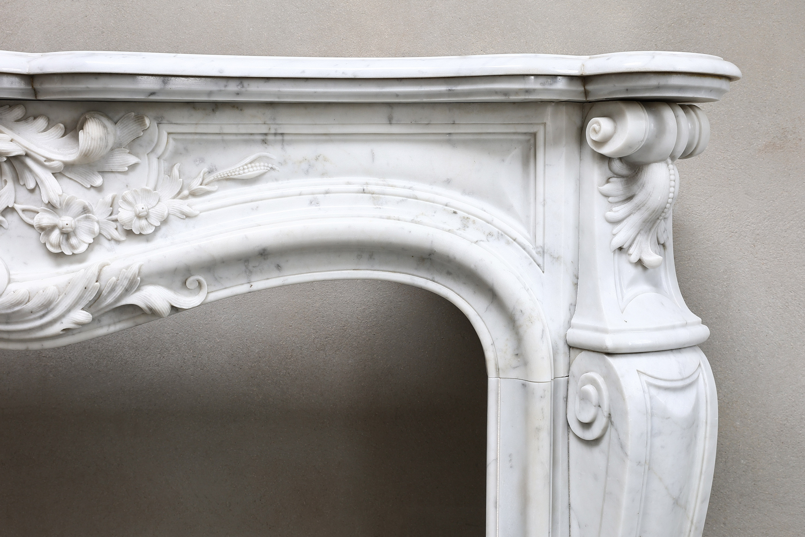 Beautiful exclusive antique fireplace made of Carrara marble from Italy! This 19th century fireplace is in the style of Louis XV and richly decorated with various ornaments in the front part and on the legs. A chic fireplace within our collection.