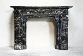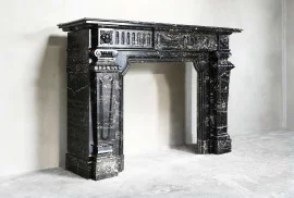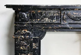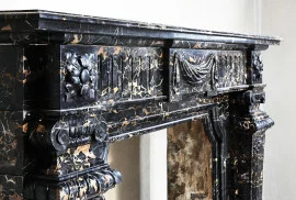 Very special exclusive fireplace of Portoro marble from the end of the 19th century. This antique mantle is in the style of Louis XVI and is particularly decorated with various ornaments and decorations. It is unique to report that this fireplace is signed by the stonecutter 'Jozef'. The warm colors and decorations + signment make this fireplace a beautiful piece!