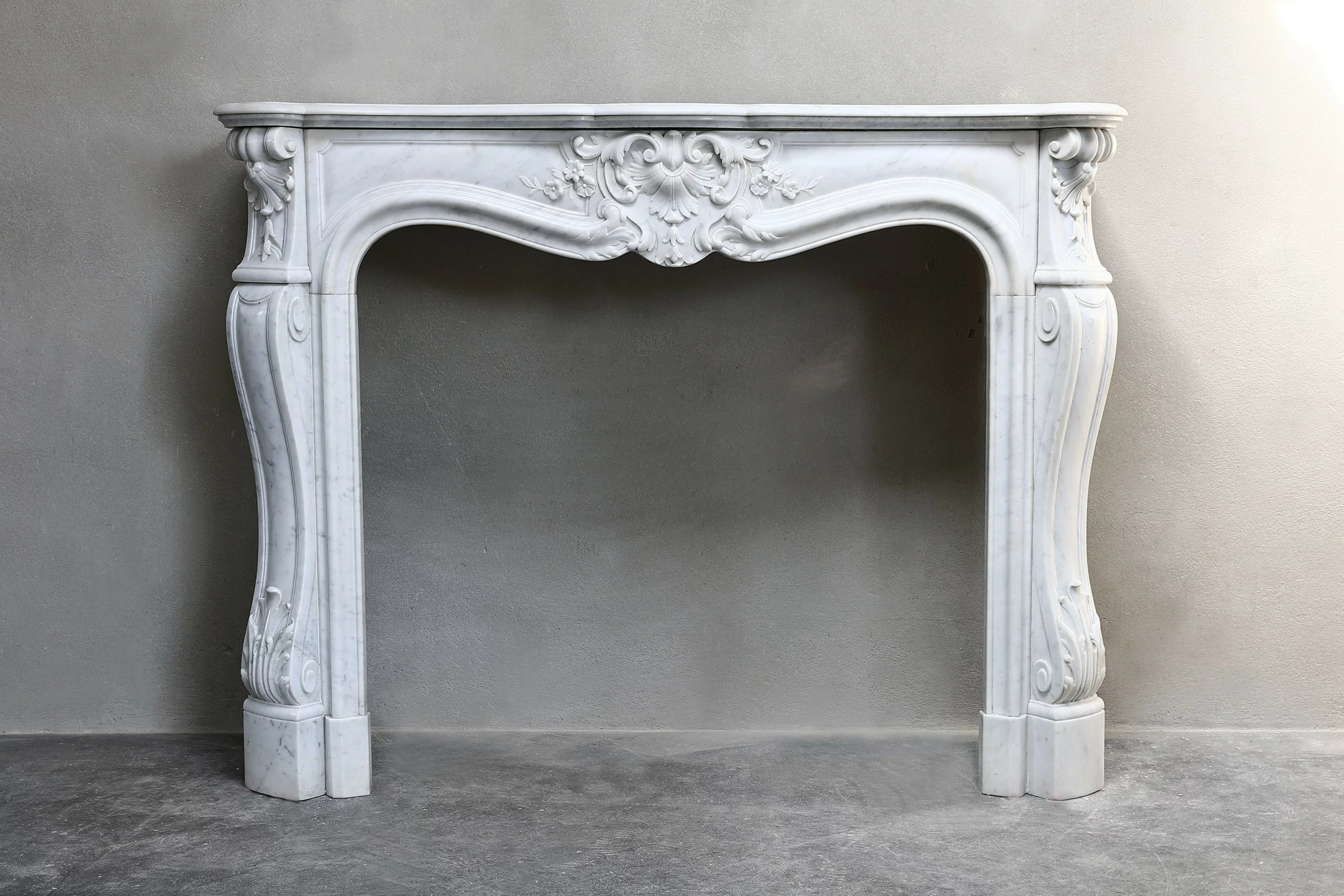 Antique Carrara marble fireplace in the Louis XV style from the 19th century. This elegant fireplace is decorated with a scallop in the middle of the front part and ornamented on the legs. A chic fireplace with original grilles on the sides.