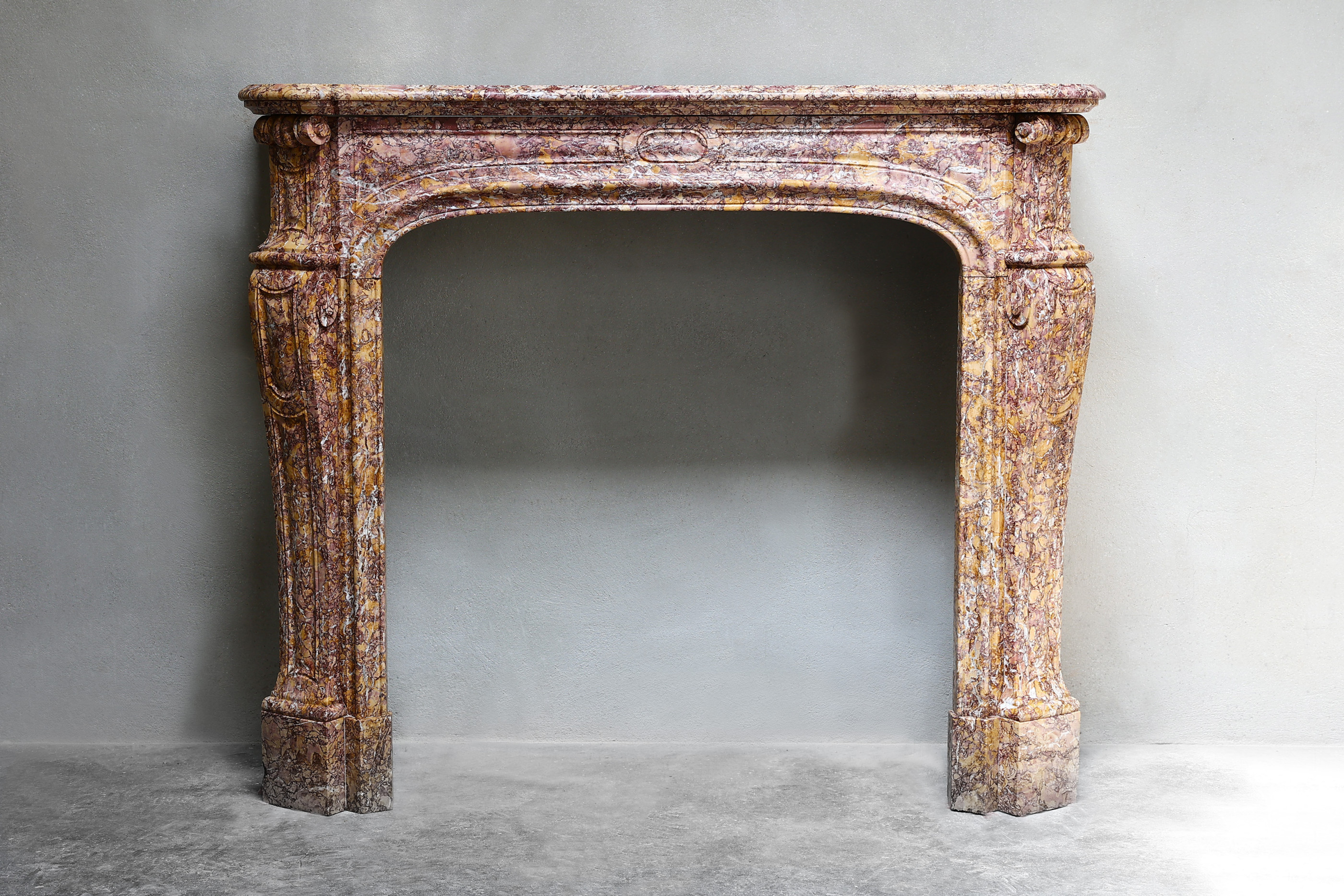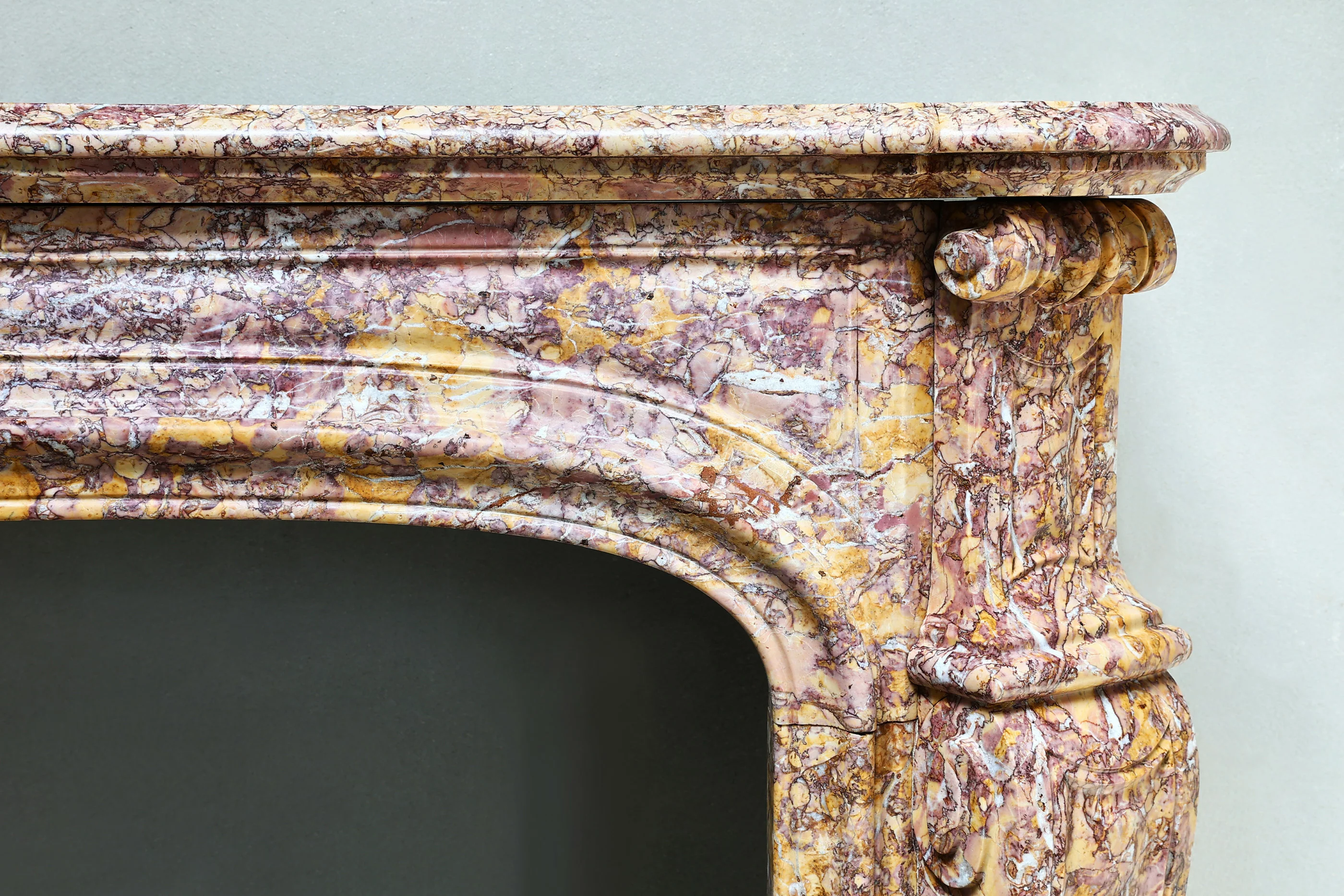 Discover this elegant 19th-century Pompadour-style marble mantel, crafted in Brocatelle Violetta du Jura from Paris. With its refined proportions and vibrant hues, it's a unique statement piece for distinguished interiors.