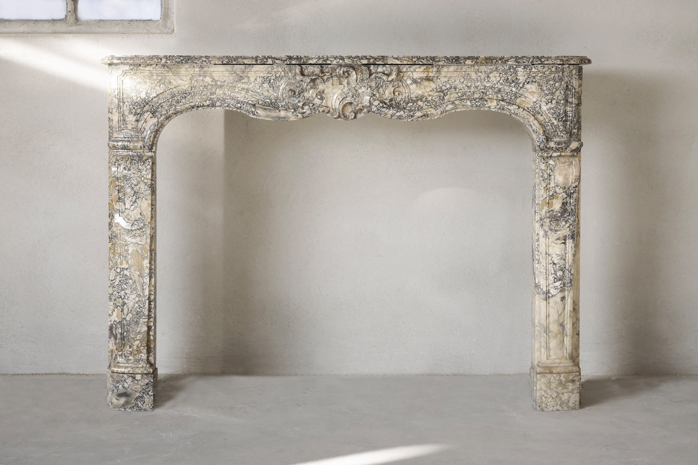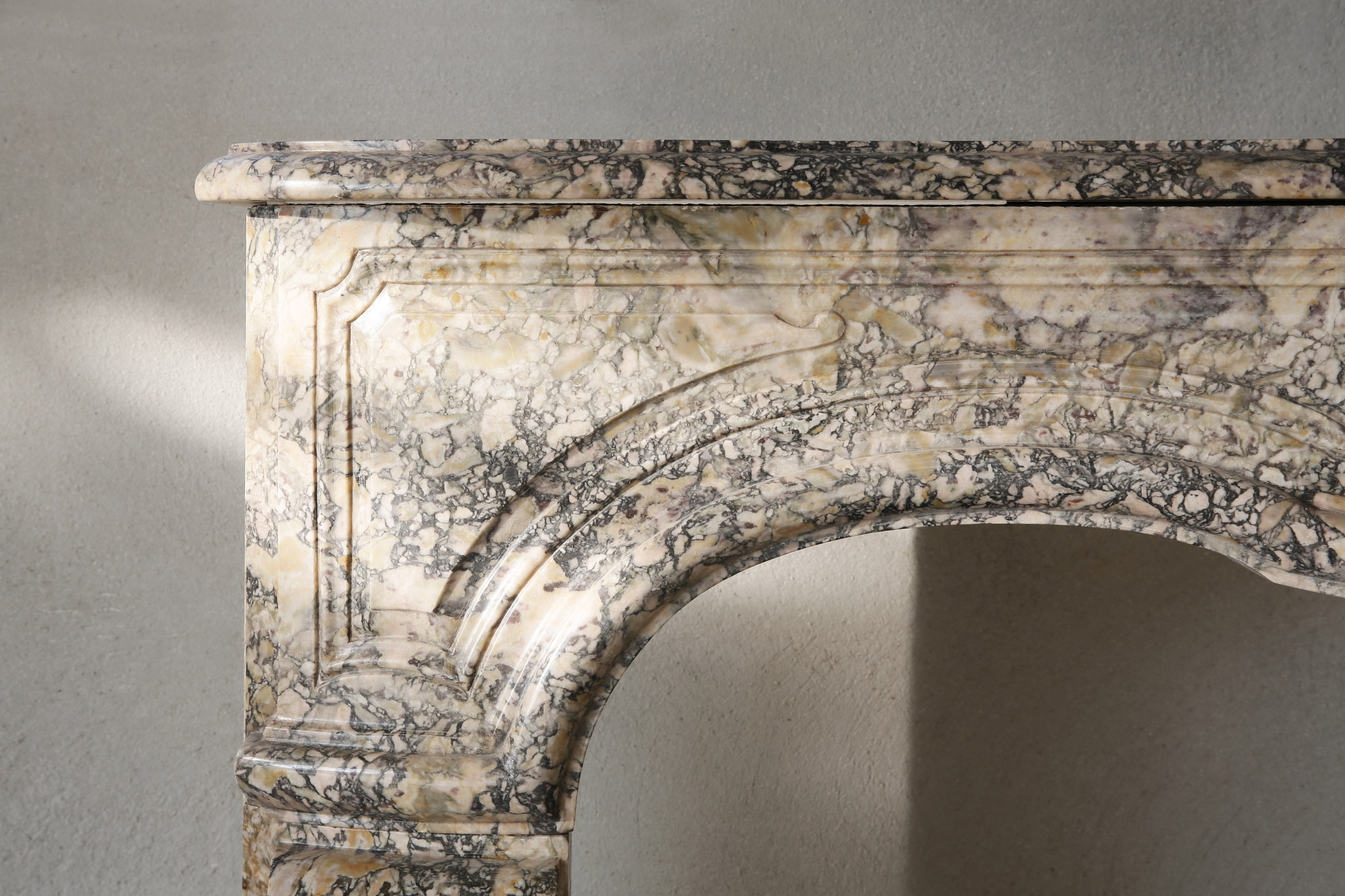 Exclusive antique fireplace from Breche marble. Breche marble is originally from Italy. The yellow/gray color nuance creates a warm atmosphere! This mantelpiece dates from the early 19th century and is entirely in the style of Louis XV. The style of Louis XV is recognizable by its graceful shape and often features a scallop in the middle. Marble is a beautiful natural stone that is unique every time and can be used for many applications.