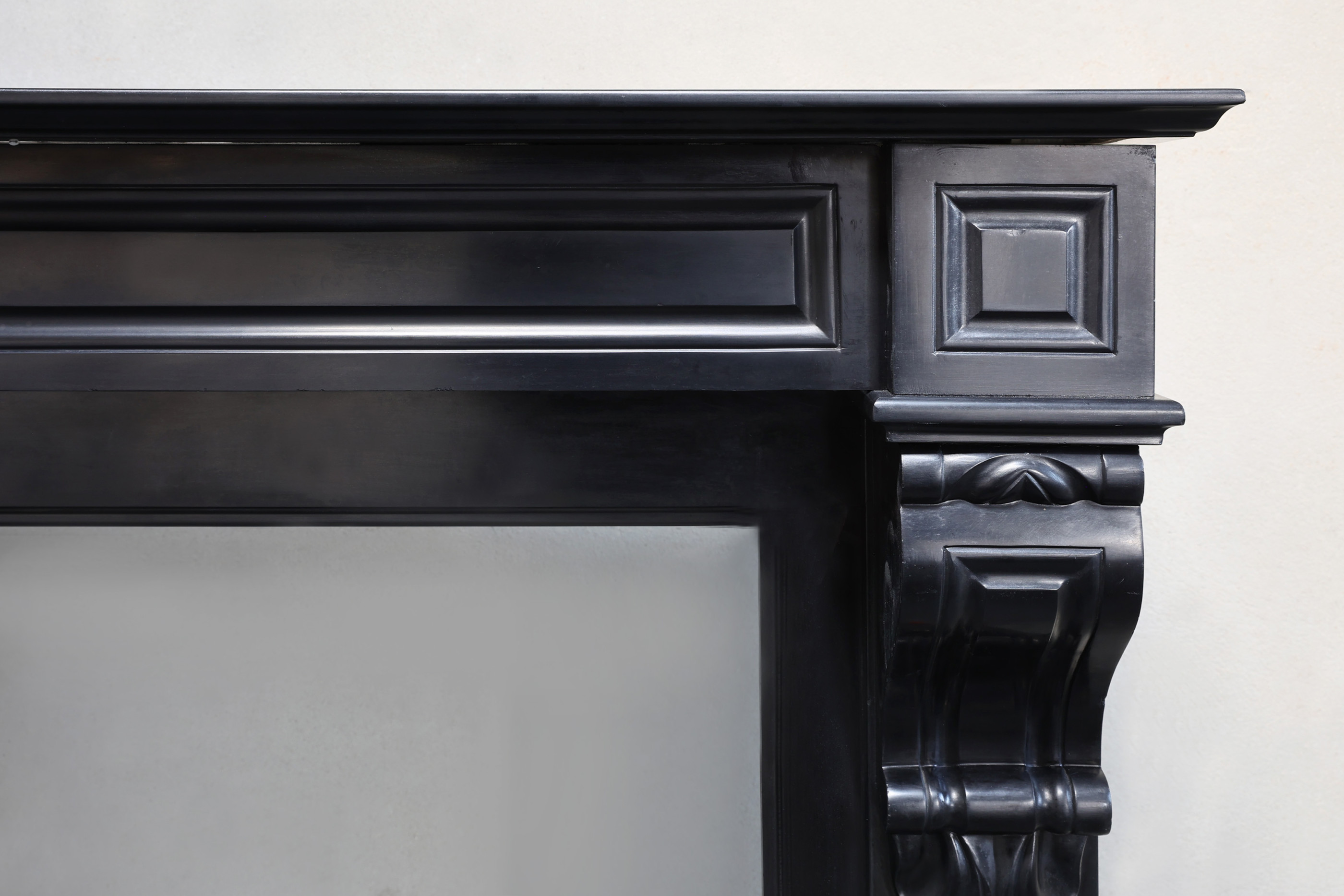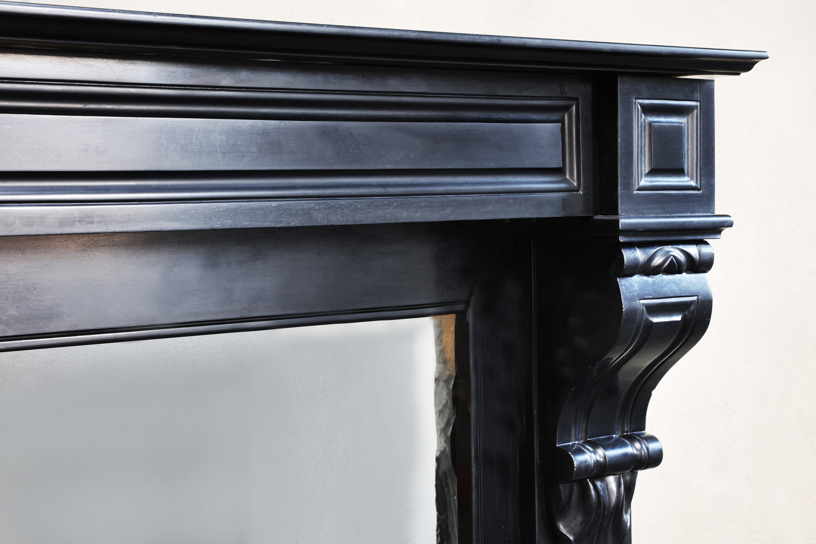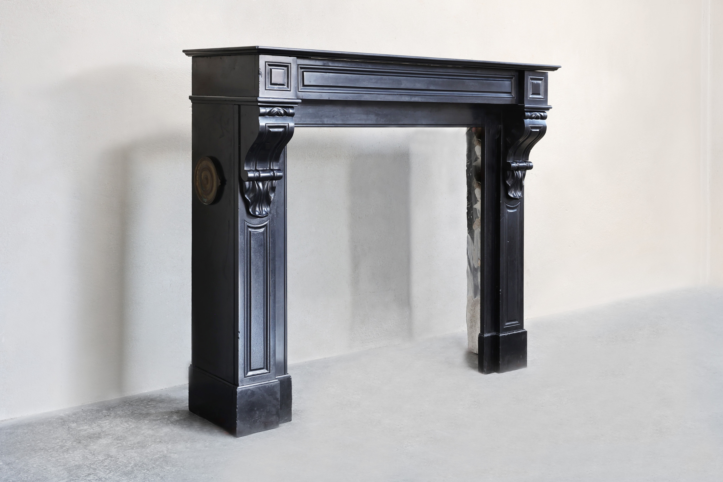 Very beautiful antique fireplace of the unique marble type Noir de Mazy from the 19th century! This marble type from Belgium is becoming increasingly rare, because a number of quarries have already closed. This fireplace is elegant and rustic and is in the style of Louis XVI.