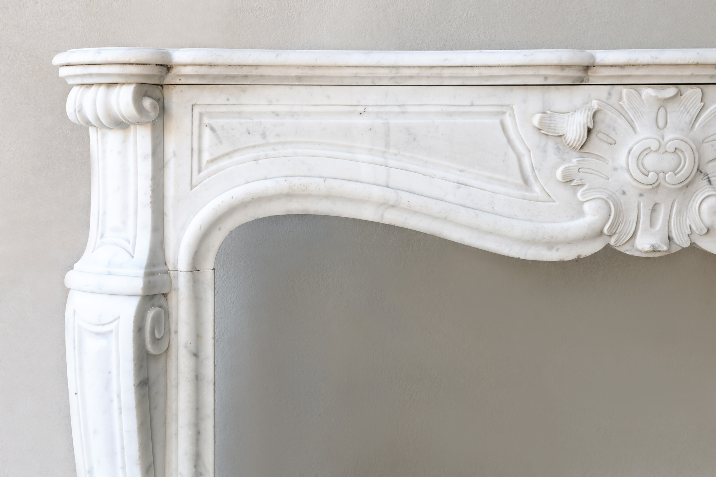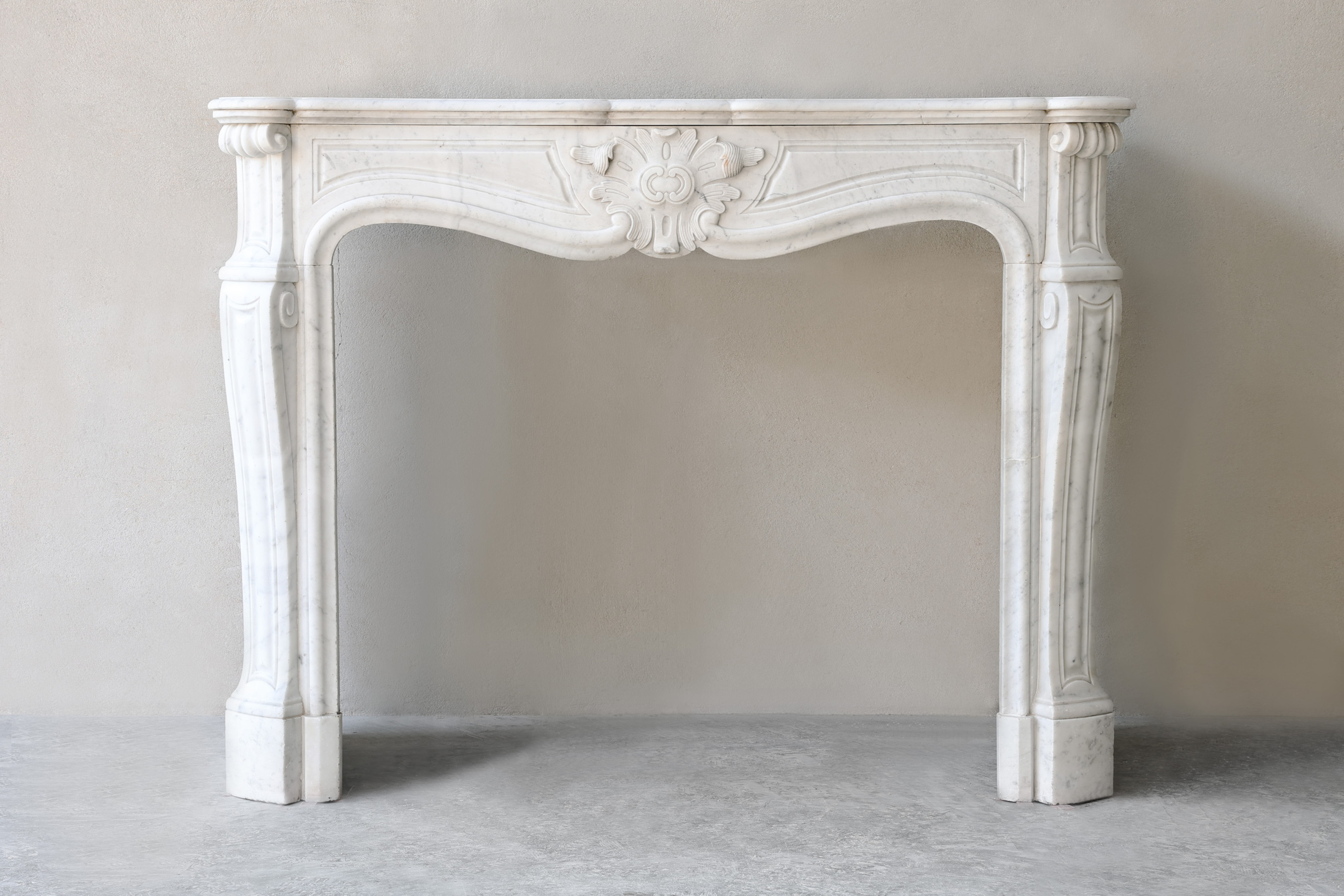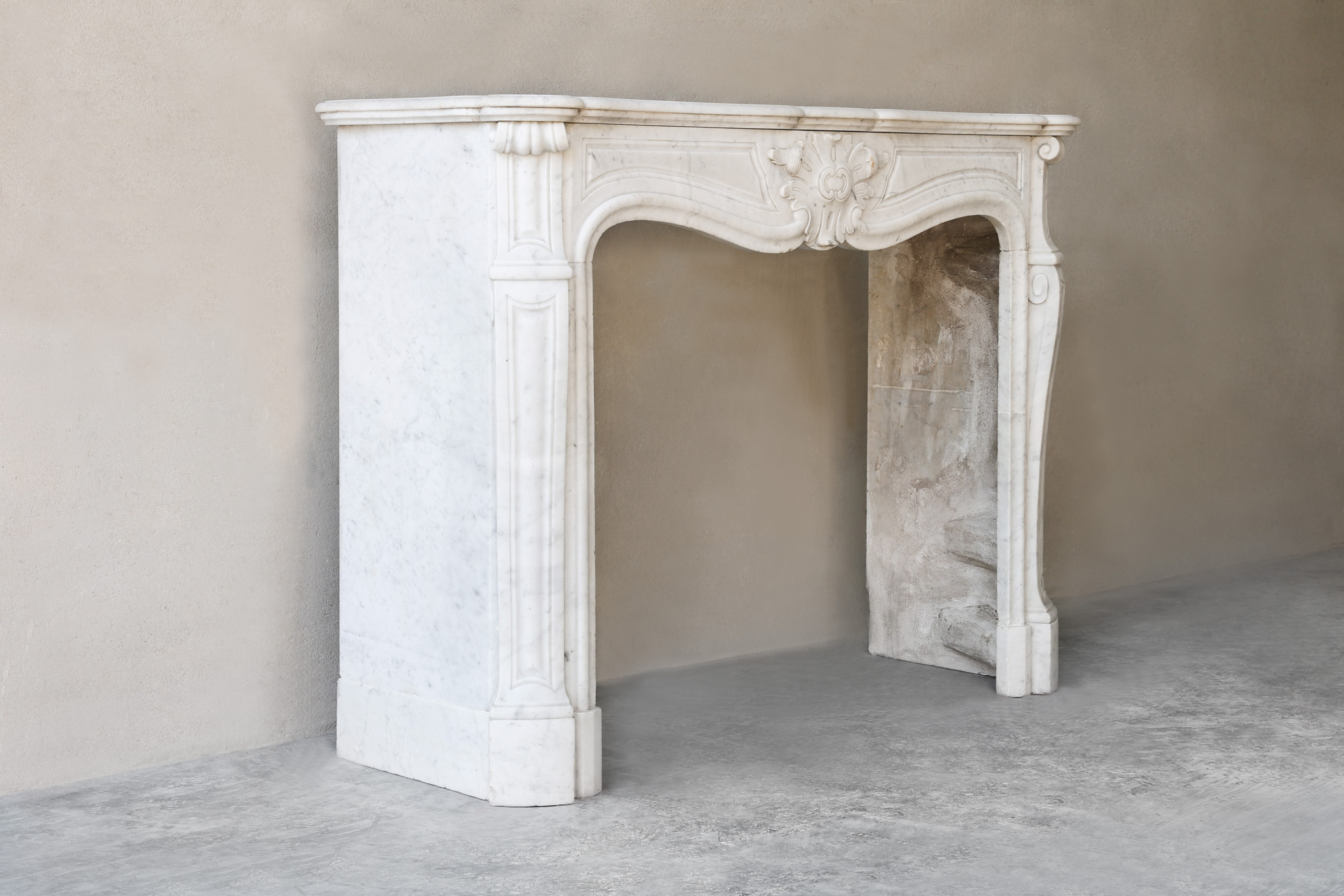 Beautiful chic antique mantelpiece of Carrara marble from the 19th century. This mantelpiece is in the style of Louis XV and has a beautiful ornament in the middle of the front part. The beautiful round lines on the legs provide an elegant and warm appearance. A mantelpiece with character and authenticity.
