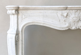 Beautiful chic antique mantelpiece of Carrara marble from the 19th century. This mantelpiece is in the style of Louis XV and has a beautiful ornament in the middle of the front part. The beautiful round lines on the legs provide an elegant and warm appearance. A mantelpiece with character and authenticity.