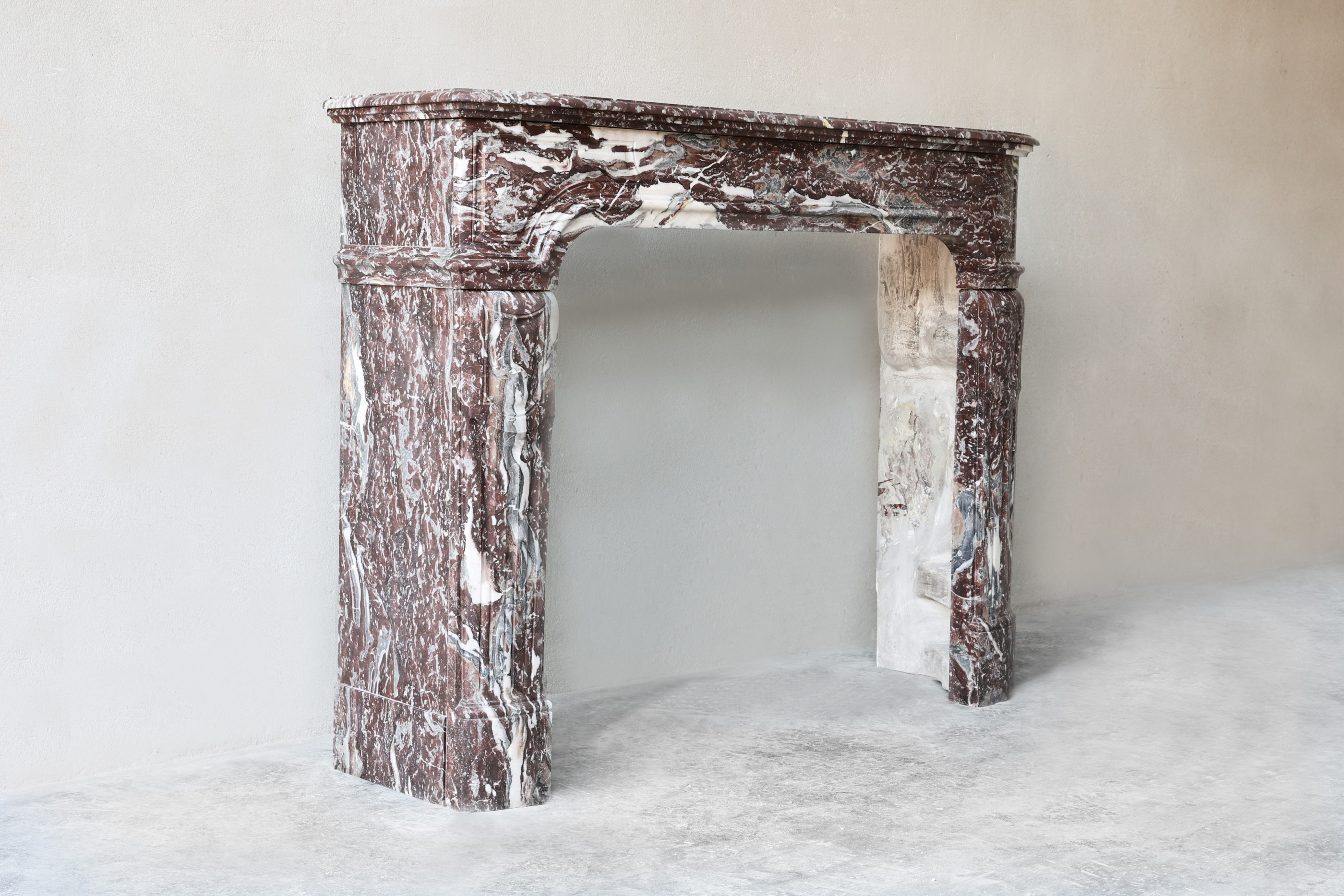 This antique fireplace is a remarkable example of 19th-century craftsmanship. It was made in Paris, France, between 1860 and 1880 and follows the elegant proportions of the Louis XIV style. The material used is Griotte de Campan Rouge, a distinguished French marble known for its deep red hues and natural veining.