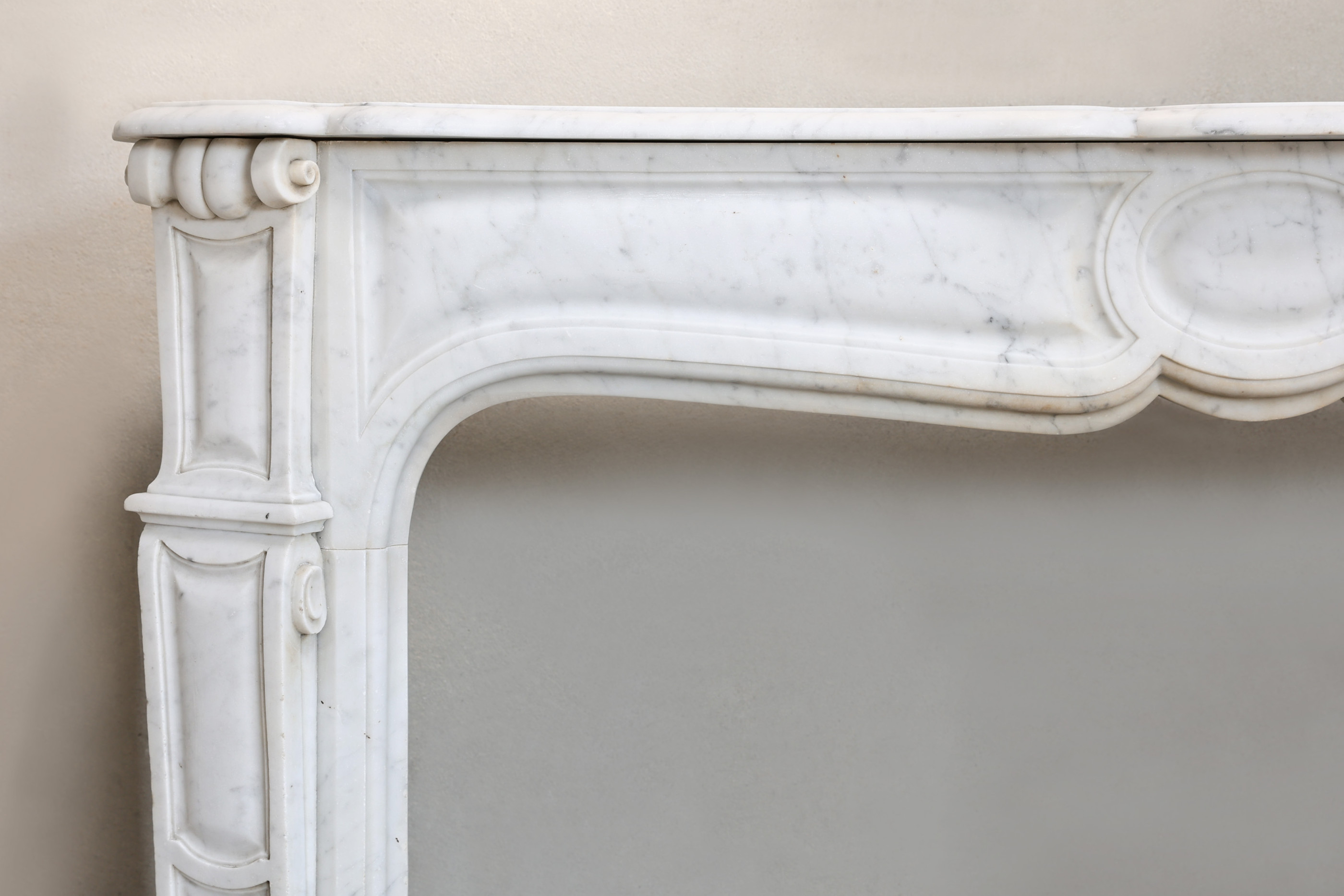 Beautiful compact and antique mantelpiece of Carrara marble from Italy. This elegant fireplace dates from the 19th century and has beautiful ornaments and fine lines on the legs. A Pompadour mantelpiece is characterized by the round ornament in the middle of the mantelpiece.
