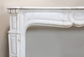 Beautiful compact and antique mantelpiece of Carrara marble from Italy. This elegant fireplace dates from the 19th century and has beautiful ornaments and fine lines on the legs. A Pompadour mantelpiece is characterized by the round ornament in the middle of the mantelpiece.