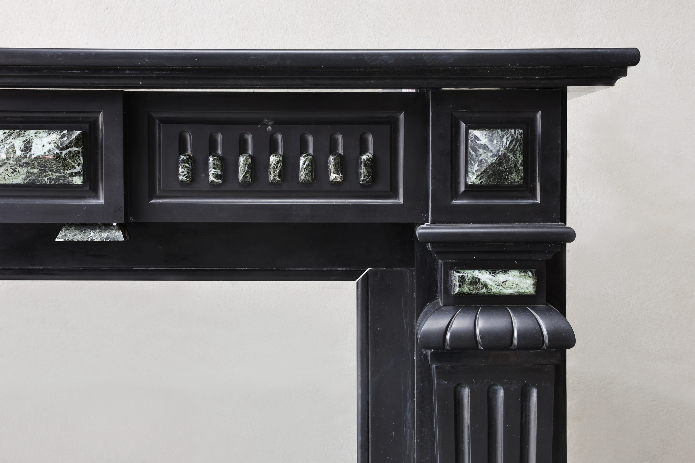 This elegant 19th century mantelpiece is made of Noir de Mazy marble, a rare black stone from Belgium, with a small piece of green Vert de Mer marble incorporated. The deep colour and fine details give this fireplace a classic and stylish look. With its sleek lines and subtle decorations, this mantelpiece fits perfectly into both a classic and modern interior. It is a unique and timeless mantelpiece that adds atmosphere and character to any room. A special piece of history for those looking for something truly special.