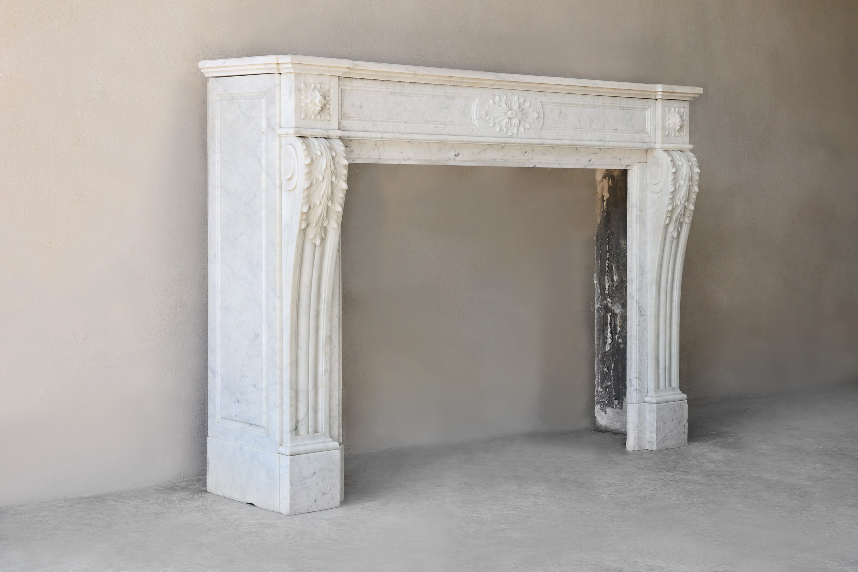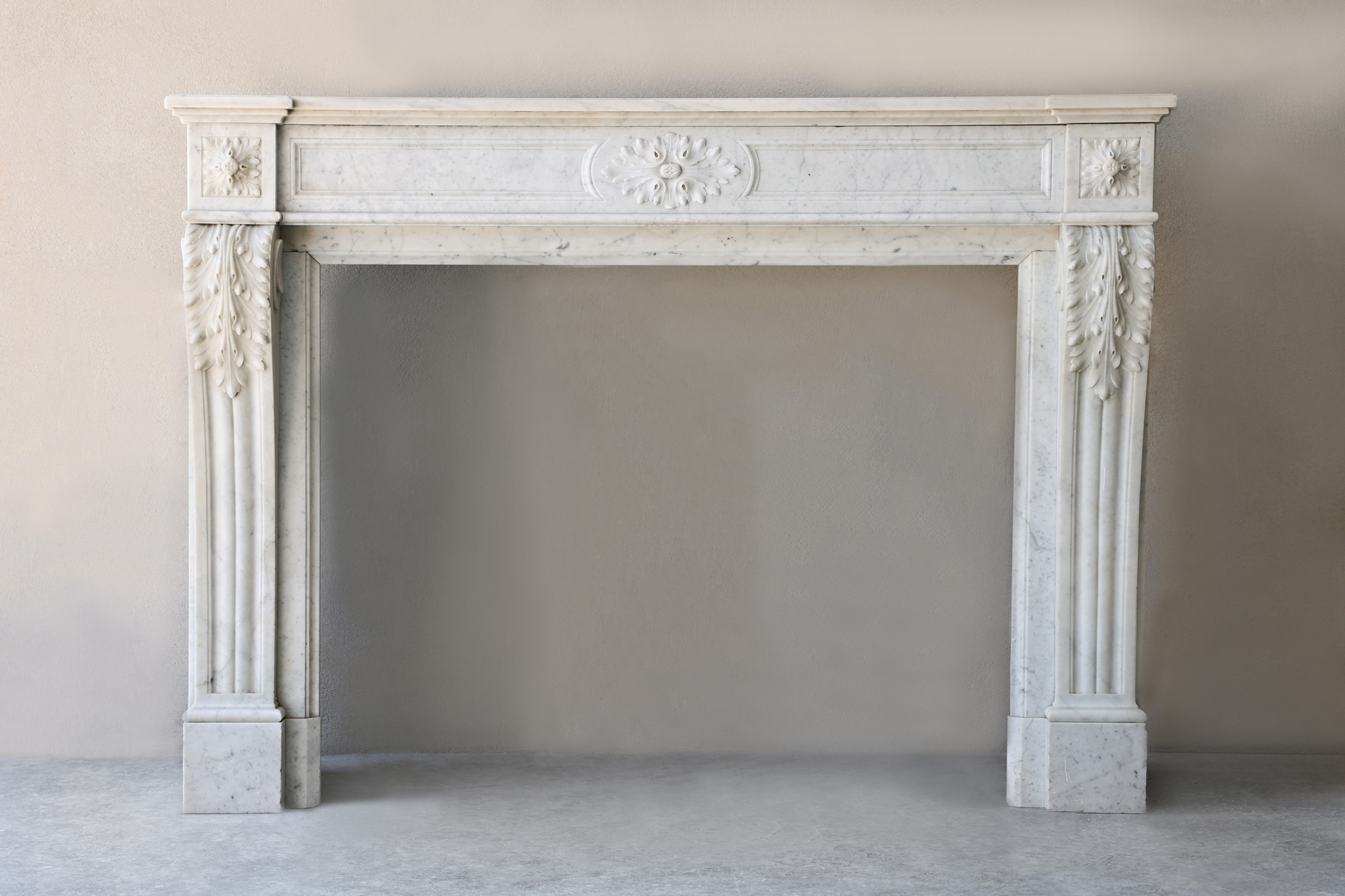 Crafted from fine Carrara marble, valued for its homogeneity and timeless appearance. The façade rests on fluted jambs with leaf capitals; the frieze features a central floral medallion – a hallmark of the Louis XVI style.