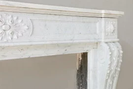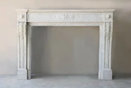 Crafted from fine Carrara marble, valued for its homogeneity and timeless appearance. The façade rests on fluted jambs with leaf capitals; the frieze features a central floral medallion – a hallmark of the Louis XVI style.
