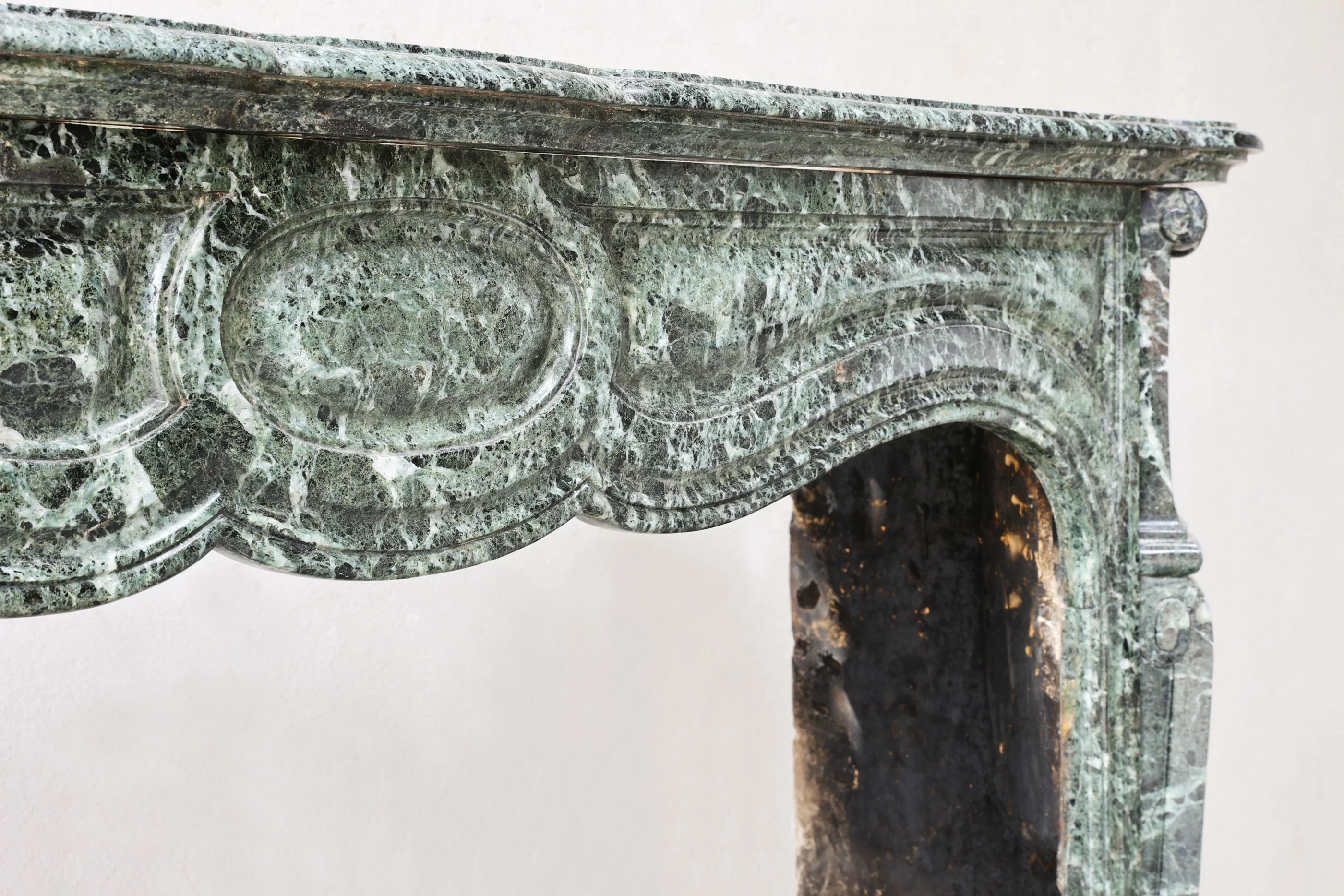 Discover this rare antique marble fireplace from the 19th century, made of exclusive Vert de Mer marble in elegant Pompadour style. With graceful lines and classic craftsmanship, this is a refined showpiece for any interior. Ideal for lovers of French antiques, classic fireplaces and exclusive marble work.