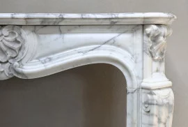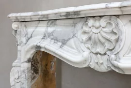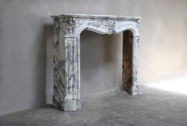 Beautiful compact fireplace of Arabescato marble from the 19th century in style of Louis XV. This antique fireplace has beautiful light veins and beautiful ornaments such as 'trois scallops', a scallop in the middle and on both legs! A chic fireplace that can be used for many interiors.