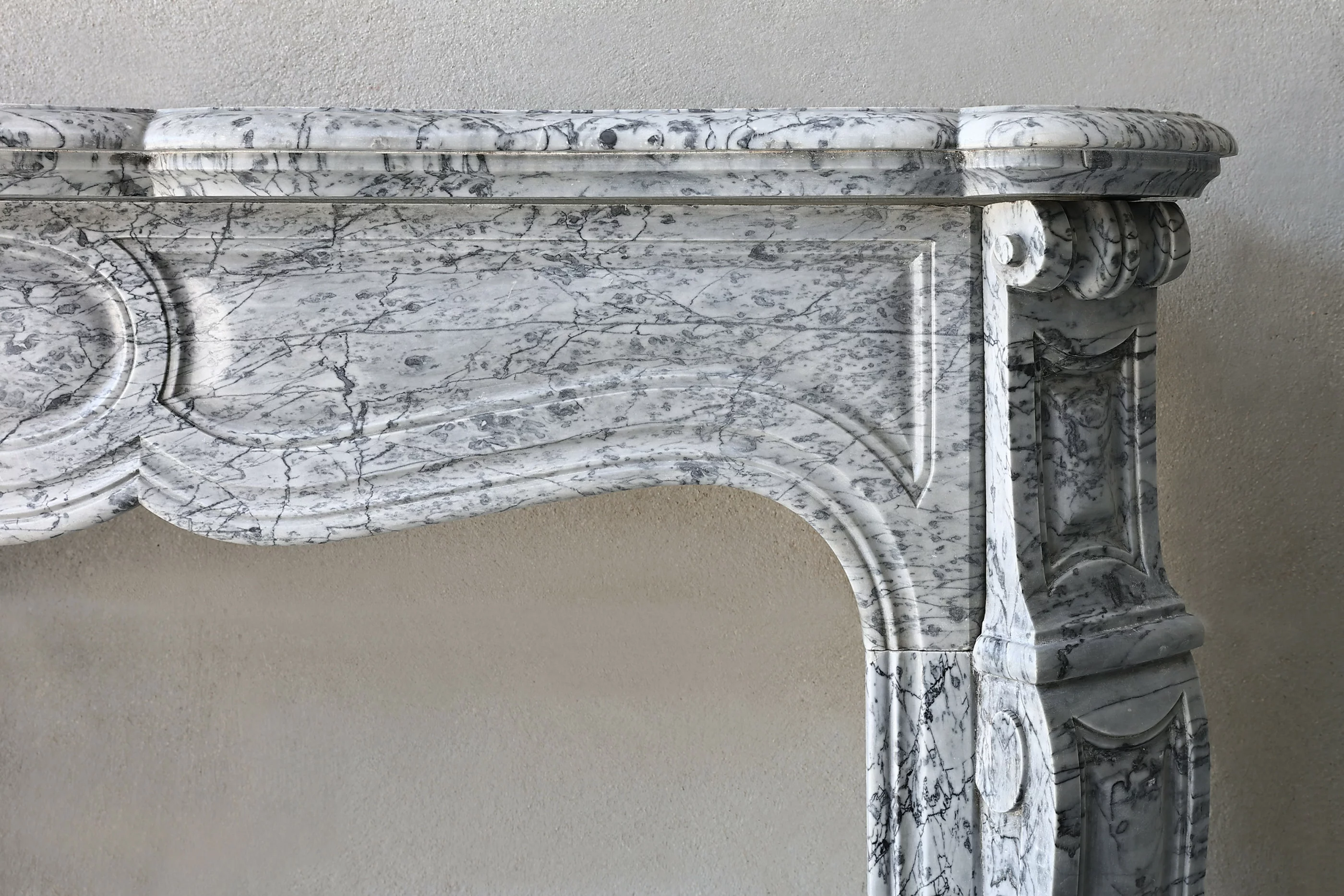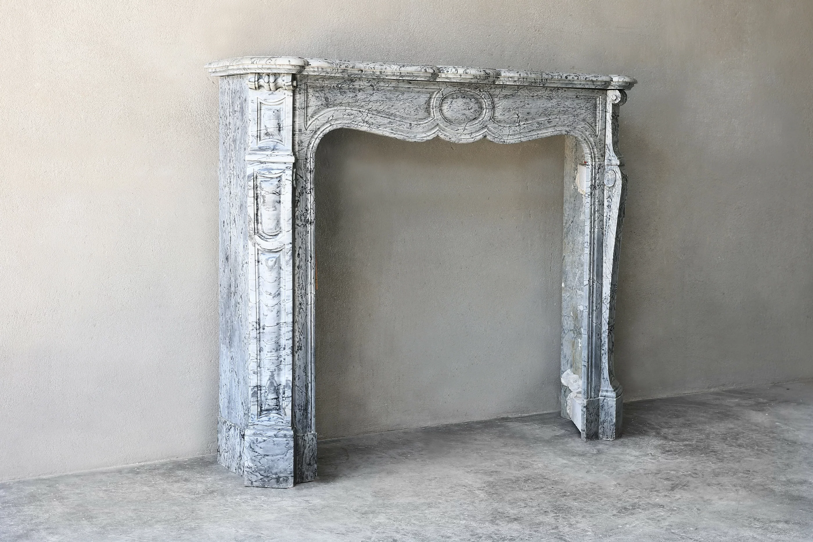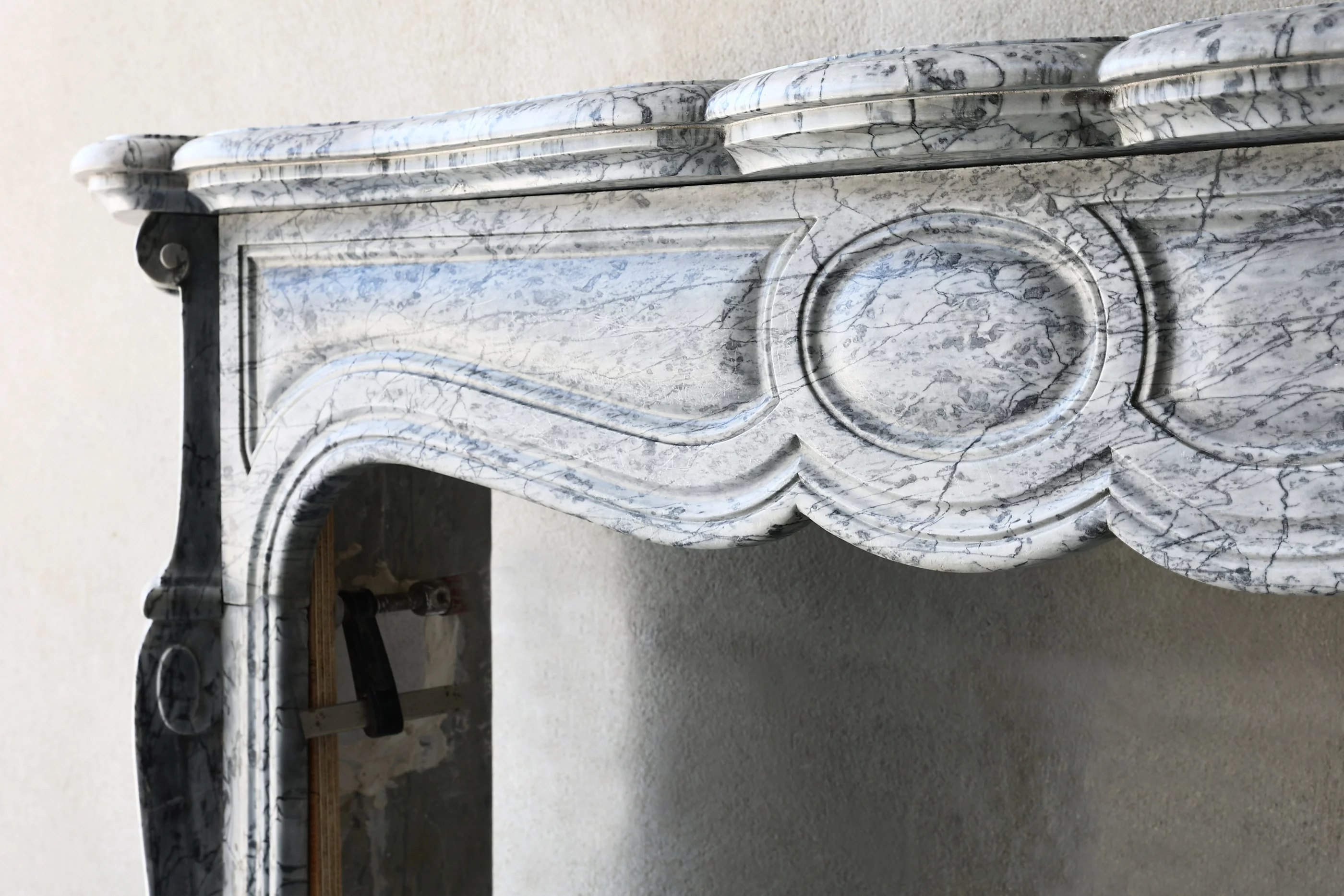 Compact antique fireplace in Pompadour style from the 19th century! This beautiful friendly fireplace has a round ornament in the middle of the front and elegant elements on the legs. The marble type is Blue Fleuri, a gray marble with light veins.