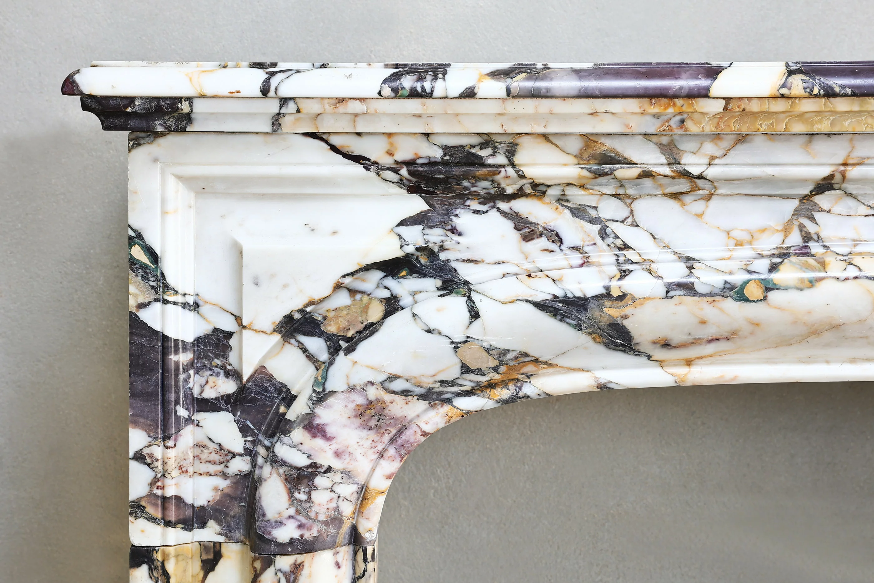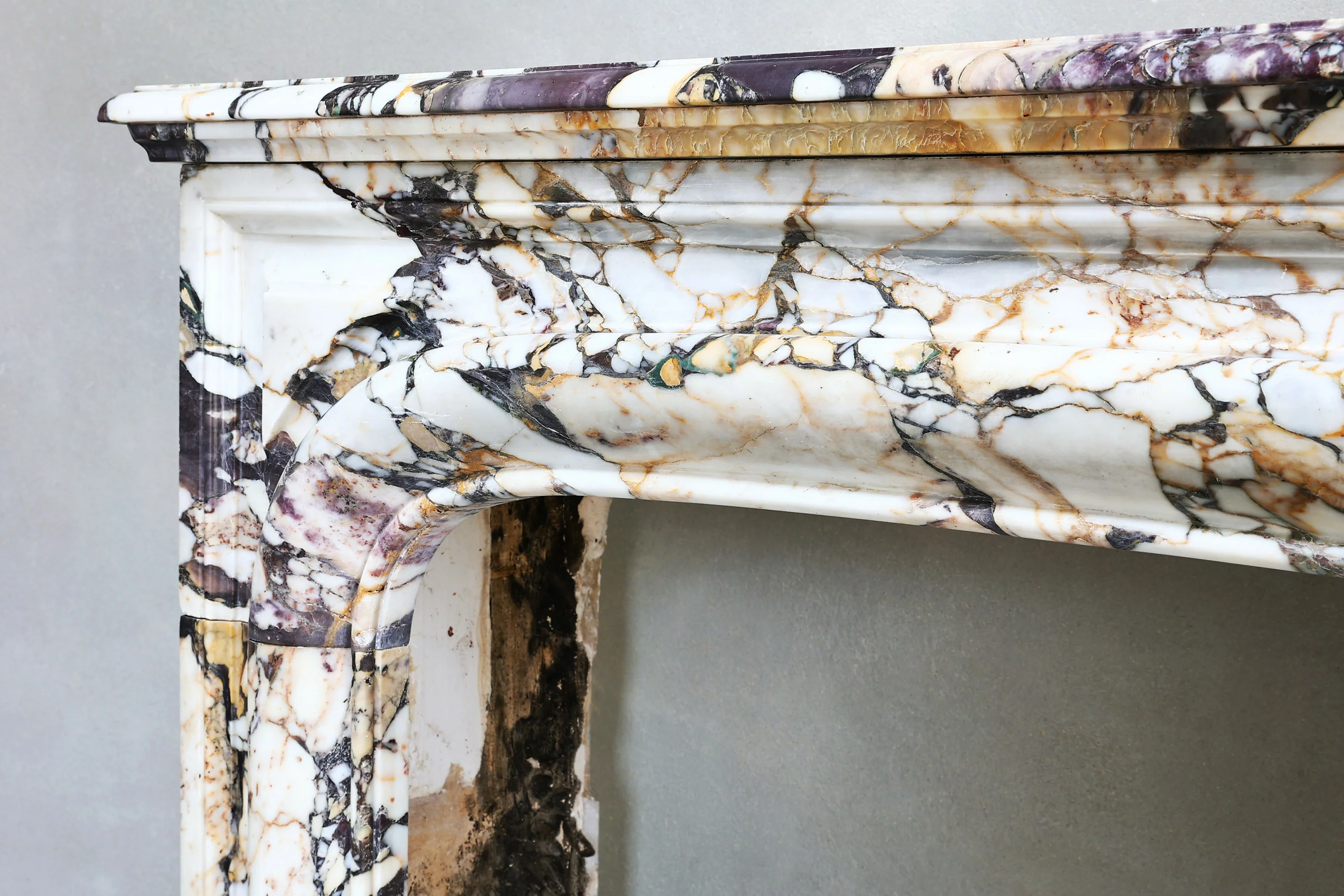 Beautiful antique fireplace of Breche marble from the 19th century in the style of Louis XIV. This special marble fireplace is colorful and sleek! The combination of this marble type and shape creates a unique fireplace.