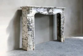 Antique chimneypiece in Paonazzo marble from the 19th century! This antique marble fireplace mantel from Paris in France surround is in the style of Louis XV and has a scallop in the middle and on the sides of the front part. Look at the beautiful veining of this Paonazzo marble from the Tuscany region in Italy.