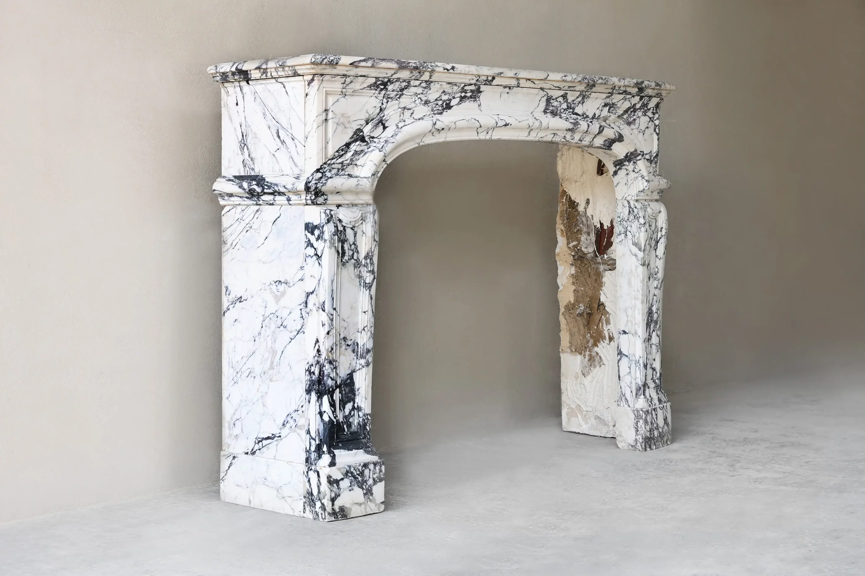 This Antique Marble Mantel is a one-off French surround dated to the 19th century, with the distinctive contrasting veining of Paonazzo marble. The profile and proportions suit design and build projects where accurate sizing, clean sightlines, and authentic material character matter. The four photos show the full front and angled view, plus close-ups of the upper corners.