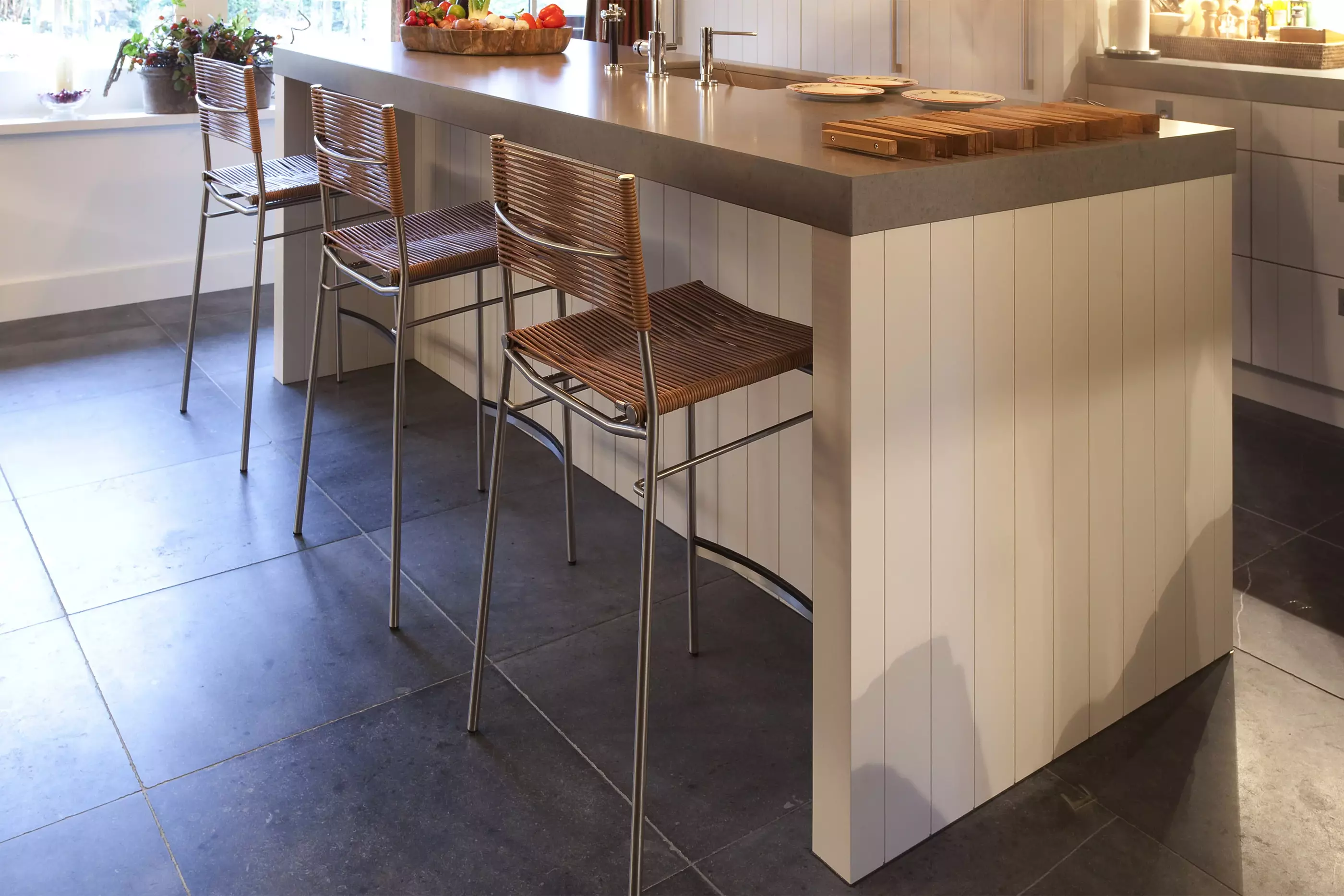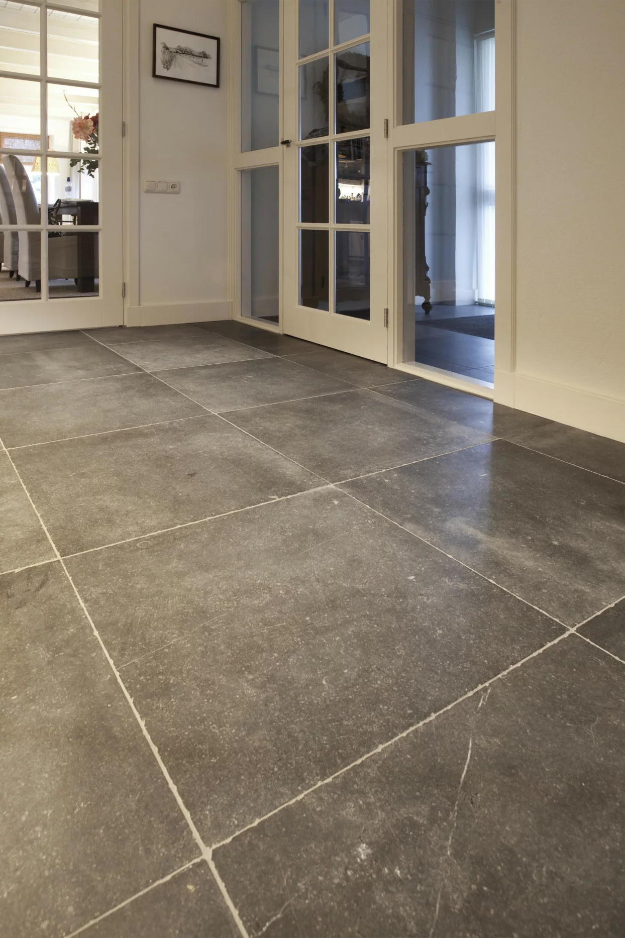We buy these plates at the blue stone quarry of Carrieres de Hainaut and Pierre Bleue Belge, saw the tiles in the desired size and sand the tiles with the right grain and sufficient pressure to this beautiful matte gray color. Magnificent......