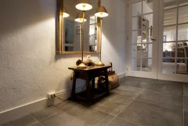 We buy these plates at the blue stone quarry of Carrieres de Hainaut and Pierre Bleue Belge, saw the tiles in the desired size and sand the tiles with the right grain and sufficient pressure to this beautiful matte gray color. Magnificent......