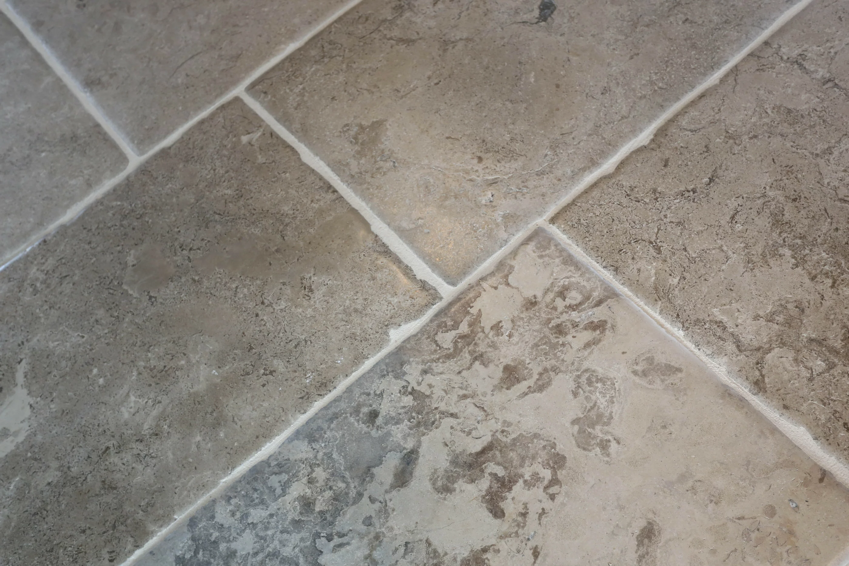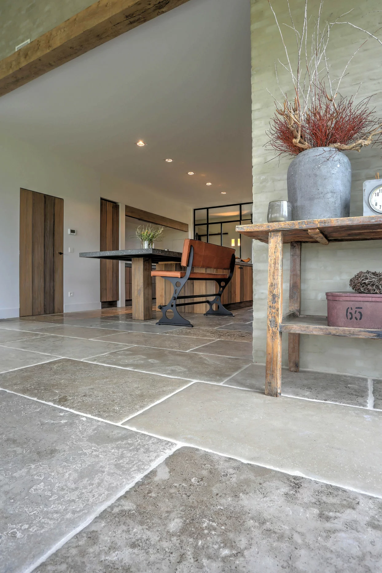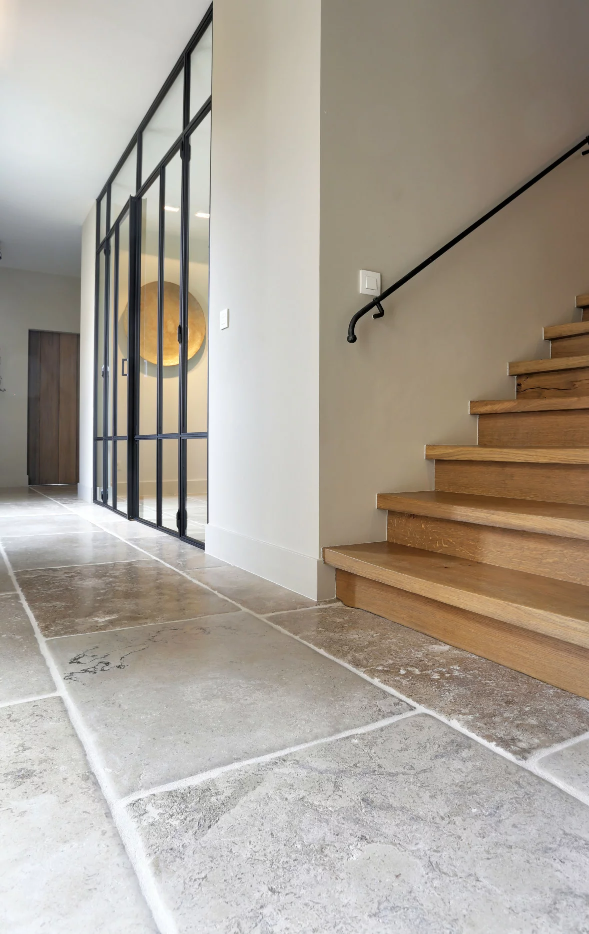 A beautiful floor of Burgundian slabs. The beautiful color scheme and authentic look ensures that your floor is and remains attractive and timeless. This natural stone floor of French limestone is our pride. We are still completely aging the floor by hand. The edges of the tile are very nicely broken and the surface is still sanded by hand so that the Burgundian valley gets the tough charactre. We can supply all sizes you want, because the floor is completely finished manually.